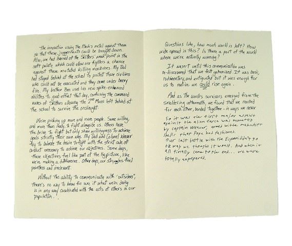 SPOILER ALERT! Season 5, Episode 10 (Series Finale) - Pages of Matt Mason's (Maxim Knight) handwritten notes, without the notebook cover, that chronicle the 2nd Mass fight against the Espheni. These pages appear to be a precursor to Matt's book titled "The Last World War by Those Who Fought it." Approx. 11 1/2" x 8 1/2".