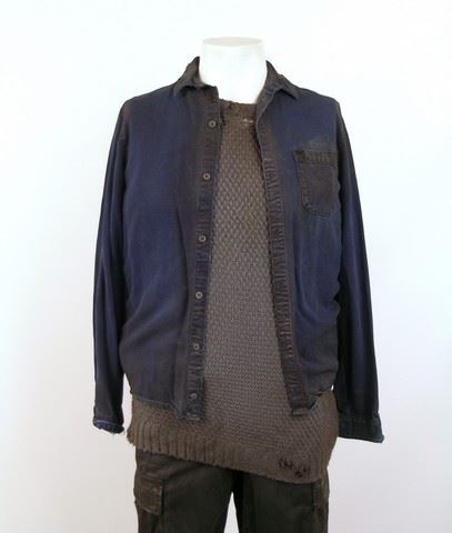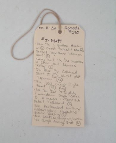 SPOILER ALERT! Season 5, Episode 10 (Series Finale) - Matt Mason's (Maxim Knight) screen worn, black zipper front with six pockets with Mandarin style collar with two snaps and topstitch detail "Oakland" jacket, dark blue button front with chest pocket "Topman" shirt, grey cable knit long sleeve "Kolby" sweater, worn blue long sleeve three button "William Rast" henley shirt, and worn black pants, black perforated leather, rubber, and fabric "Oakley" fingerless gloves, and black leather lace up the front boots. Includes wardrobe tag.