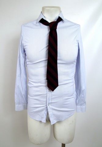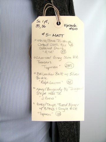SPOILER ALERT! Season 5, Episode 10 (Series Finale) - Matt Mason's (Maxim Knight) screen worn, grey/taupe tweed three pocket and single vent "Topman" blazer, white and blue pinstripe long sleeve button front "H&M" shirt, navy and burgundy diagonal stripe "J. Crew" wool neck tie, black leather with silver buckle "Ralph Lauren" belt, charcoal grey slim fit "Topman" trousers, and black leather lace up the front "Topman" boots. Includes wardrobe tag.