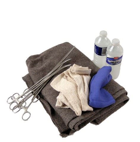 Season 5, Episode 6 - Medical supplies used in the "Respite" episode, including medical scissors, a grey blanket, two towels, and two plastic bottles of water.