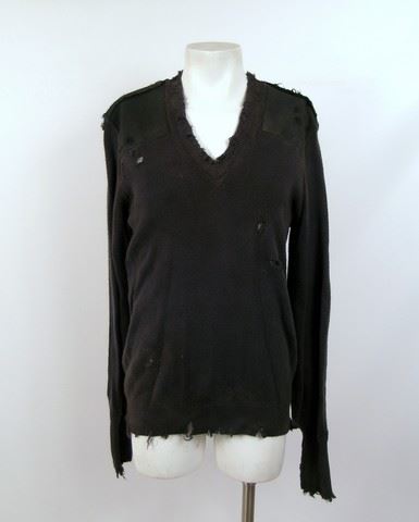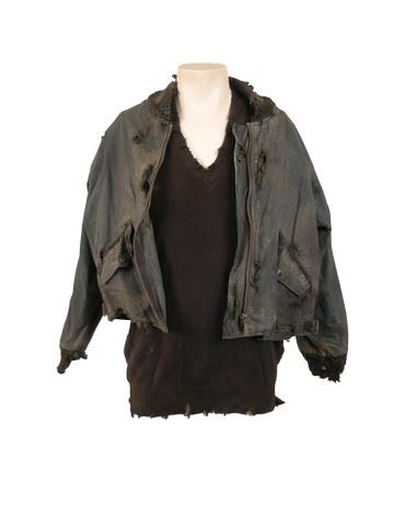 Season 5, Episode 5 - ND Survivor's (Chad Riley) screen worn, distressed, blue zipper front with pockets long sleeve jacket with black trim, and black with patches at the shoulders and the elbows sweater. Includes wardrobe tag.