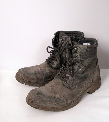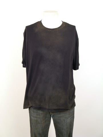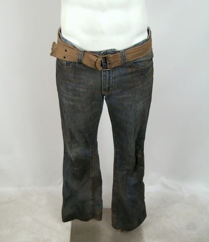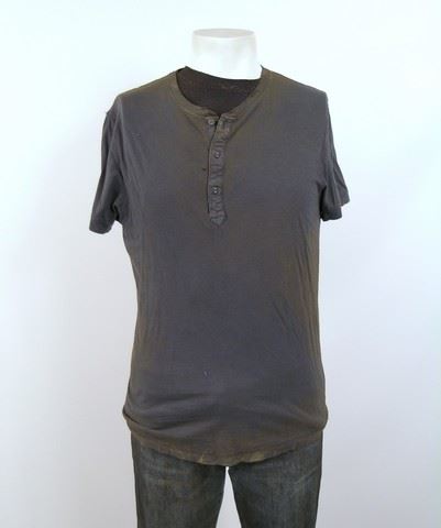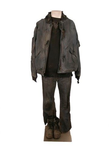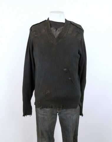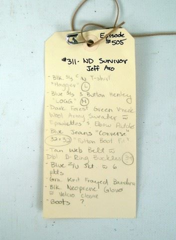 Season 5, Episode 5 - ND Survivor's (Jeff Aro) screen worn, distressed, blue zipper front with six pockets jacket, dark forest green v-neck wool with epaulettes and elbow patches army sweater, blue short sleeve three button "LOGG" henley shirt, black short sleeve crew neck "Hagger" t-shirt, black neoprene gloves, green knit frayed bandana, tan web belt, blue "Converse" jeans, and black lace up the front boots. Includes wardrobe tag.