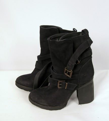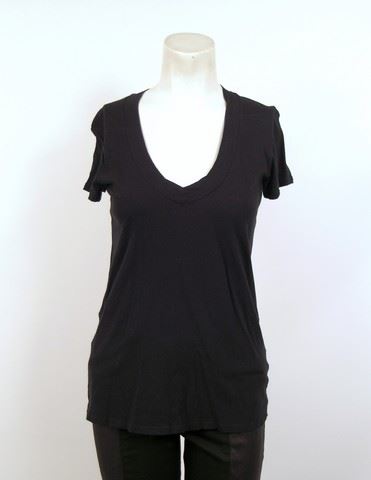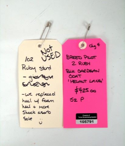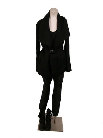 Season 1, Episode 2 (Part two of Pilot Episode) - Ruby screen worn in stunt sequences, black wool with large lapel snap closure at the shoulder, two slash pockets and black waist belt "Helmut Lang" jacket, black short sleeve v-neck "James Perse" t-shirt, black with leather panels "Joe's" stretch pants, and black leather with wrap around straps and buckles "Steve Madden" shoes with switched out heel. Includes wardrobe tag and Turner Broadcasting System sticker #105791.