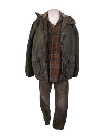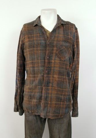 Season 5, Episode 3 - Ryan's (Chris McNally) screen worn, distressed khaki green zipper front three pocket with quilted lining "Divided" jacket, rust, blue, and black long sleeve button front flannel plaid "Isolid" shirt, heather gold short sleeve v-neck "H&M" t-shirt, tobacco orange leather belt, and grey vintage straight "Banana Republic" pants.
