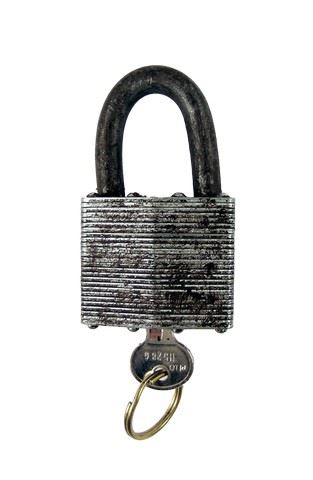 Season 5, Episode 8 - Weathered, muddied silver Master padlock rigged to pop off during filming. Includes padlock key. Approx. 3 1/2" x 2".