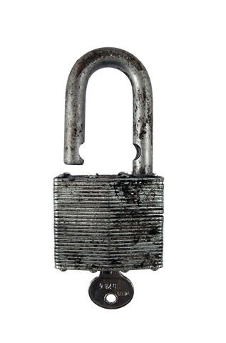 Season 5, Episode 8 - Weathered, muddied silver Master padlock rigged to pop off during filming. Includes padlock key. Approx. 3 1/2" x 2".