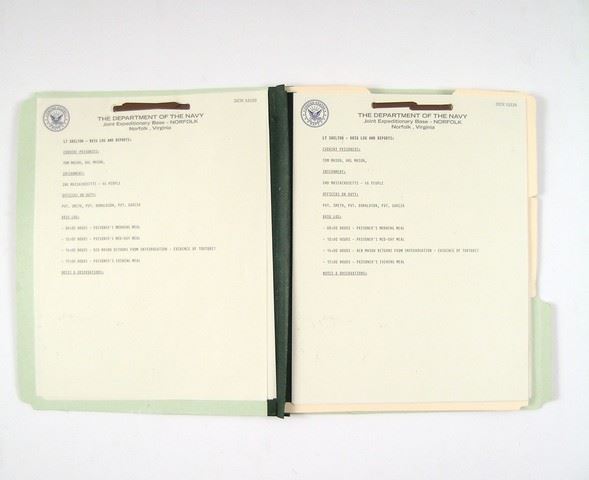 Season 5, Episode 8 - Sergeant Trevor Huston's (Lane Edwards') naval Brig Log and Reports, which lists the two current prisoners as Tom Mason (Noah Wyle) and Hal Mason (Drew Roy) and 46 people of the 2nd Mass as interned. Also lists Naval Officers on duty and a log of the day's events such as "Ben Mason returns from interrogation - Evidence of Torture?" listed at 14:00 hours. This report was prepared on "The Department of the Navy - Joint Expeditionary Base - Norfolk" stationery with the United States Navy seal in the upper left corner. Approx. 12" x 10".