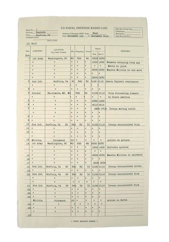 Season 5, Episode 7 - U.S. Naval Defense Radio Log (month of November) for the Norfolk, Virginia zone which lists remarks such as "Beamers dropping from Sky, Mechs no juice, and Masons Militia on the move." Approx. 14" x 9".