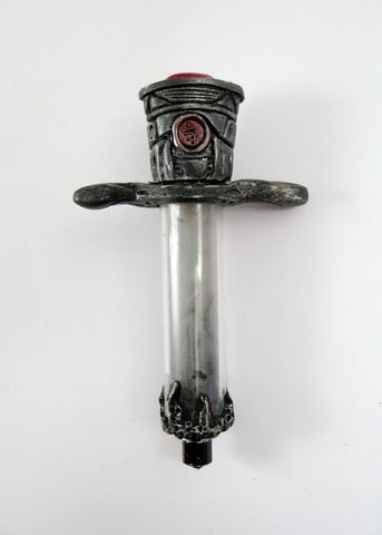 Season 5 - Used for medical purposes, these Volm syringes merge advanced Volm technology and medieval design reminiscent of earth's Vikings in the Middle Ages. The rugged, metallic handle with etched patterns and blood-red accents and grey-black metal flaming up from the bottom of the syringe are distinctly Volm. Made of plastic, acrylic, and rubber. Set includes two syringes. Each syringe is approx. 5 1/2" long.