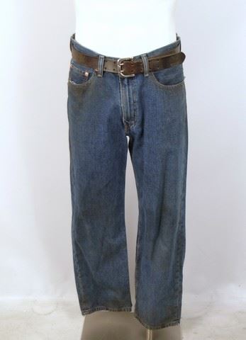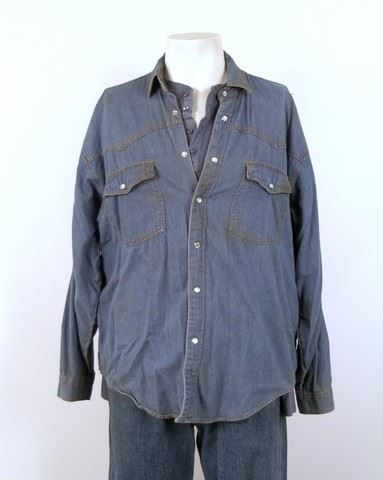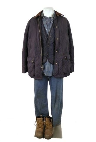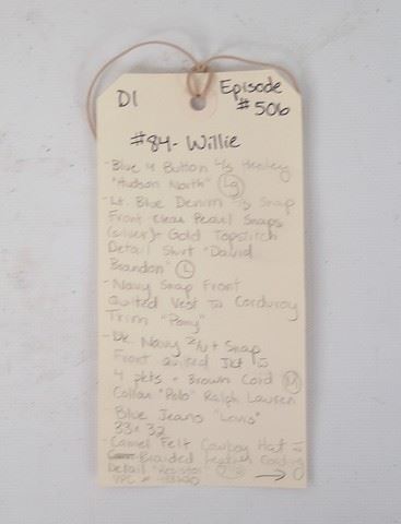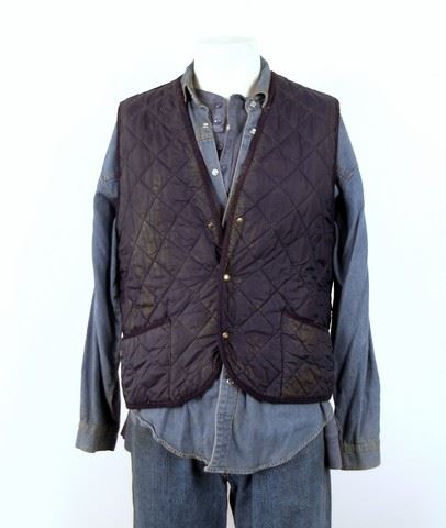 Season 5, Episode 6 - Willie McComb (Timothy Webber) screen worn, dark navy zipper and snap button front quilted with brown collar "Ralph Lauren" jacket, navy snap front quilted with corduroy trim "Pony" vest, light blue denim long sleeve snap front "David Brandon" shirt, blue four button at the neck long sleeve "Hudson North" shirt, brown leather belt, blue denim "Levis" jeans, and tan brown lace up the front "Genuine Dickies" work boots. Includes wardrobe tag.
