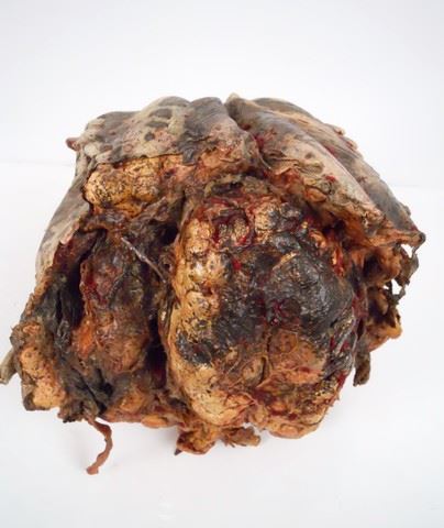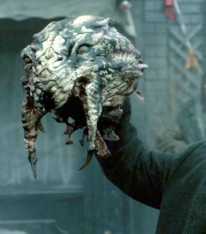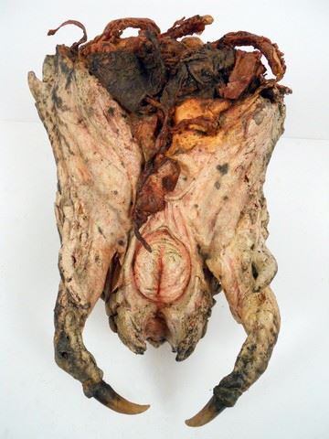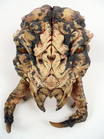 Season 5, Episode 1 (14:57 minutes) - The Hornet's Head appears in perhaps the most iconic, memorably visual moment of "Falling Skies," when Tom Mason (Noah Wyle) uses it to rouse the 2nd Mass to find their inner rage. Hero moments just don't get bigger than this. In a dream sequence, the vanquished Dornians tell Tom that their species no longer exists, because they didn't find their inner rage in their battle for survival against the Esphenis. They warn Tom to "Find Your Warrior" before it's too late. With this in mind, Tom gives a rousing speech to the 2nd Mass. He concludes with, "Soon the time will come for us to go back to being doctors and bricklayers. School teachers, mothers and fathers. But that time is not now. That is not who we are. Right now we are warriors. And so I'm putting a challenge to each and every one of you, to find your warrior!" He holds high a Black Hornet's head, to the cheers from the multitudes. The game is on. The Masters FX team knocked this one out of the park, with a fiercely evil Hornet's Head that has "predator" written all over it. Without a single vulnerable feature, and a black-and-tan striping that just hints of a tiger, this Espheni creature is the perfect choice to incite the warrior in anyone. Made of latex and foam. This Hornet's Head has been severed. Approx. 17" x 12" x 11".