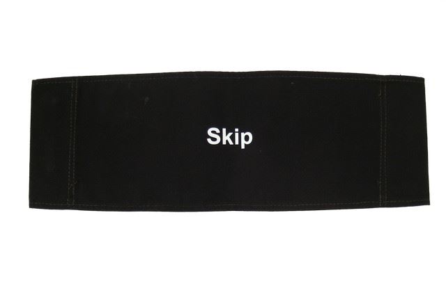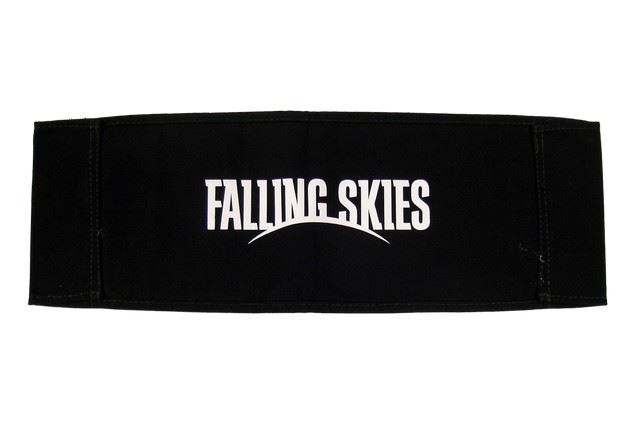 Skip's (Joshua J. Ballard) black canvas chair back with "Falling Skies" logo printed in white letters on one side and "Skip" printed in white letters on the reverse side. Approx. 21" x 7".