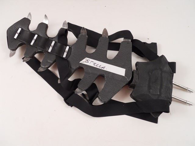 Season 1, Episodes 1 & 2 ("Pilot" episode) - The Espheni "Harness" strikes fear in species across the universe, as it turns disparate life-forms into enslaved Skitters with unseemly biomechanical efficiency. This heinous apparatus has silver vertebra that mimic a backbone and six claw-like appendages that attach to the unfortunate "host" that shall be transformed against its will. This particular harness was used to Skitterize the earthling named "Stella" in the "Pilot" episode. Made of aluminum and hard black plastic, with canvas straps. Approx. 19" x 10" x 3".