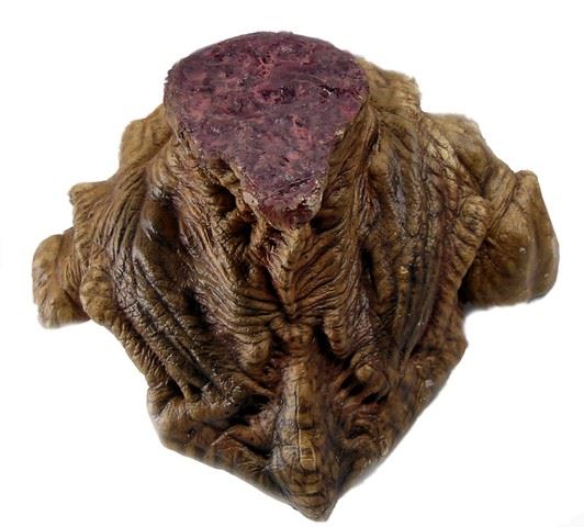 This exquisitely detailed fiberglass stump was used in production, to hold a Skitter head and mimic its neck. Each Skitter has been created with its own particular facial features, to imbue it with individual personality. Todd Masters of Masters FX and his special effects team have upped the ante in creating the life-like Skitters, by combining cutting-edge technology with animatronic artists, puppeteers, and Skitter Performers such as Keith Arbuthnot. Skitters in close-up are real and possess their own distinctive movement and facial expressions. The Skitter head stump is made of fiberglass and measures approx. 24" x 13".