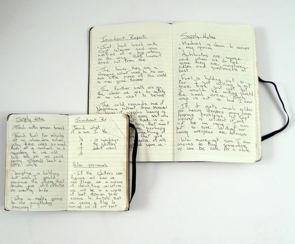 Tom Mason's (Noah Wyle's) musings and logistical notes are handwritten in his two black, worn leather bound Journals. For instance, Tom writes a historical reference about the weather, "The cold reminds me of Napoleon's retreat from Moscow" and a humorous notation about the food supply, "Bark soup is not as bad as I hear." Includes an elegant silver and black writing pen. Approx. 8 1/2" x 5".