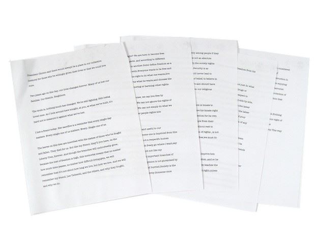 Episode 303 - Tom Mason (Noah Wyle) white paper with large print typed speech. (approx. 8 1/2" x 11")