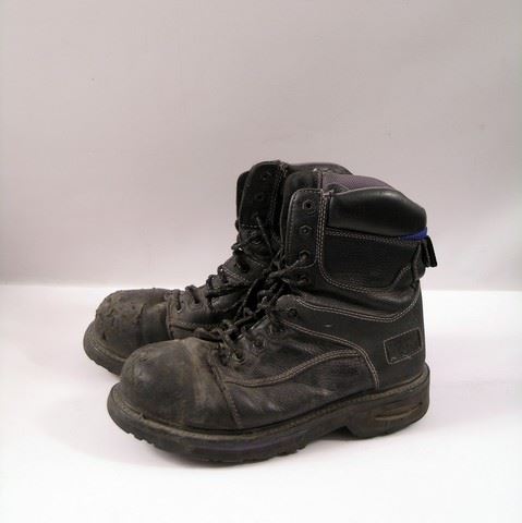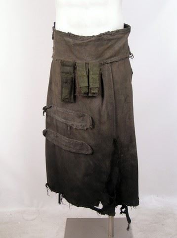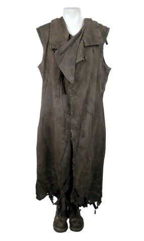 Volm (Brett Currie) screen worn, very distressed green with leather buckles and straps at the chest cut off sleeves heavy coat, green with pockets on the front velcro at the back apron, and black lace up the front work boots. Includes wardrobe tags.