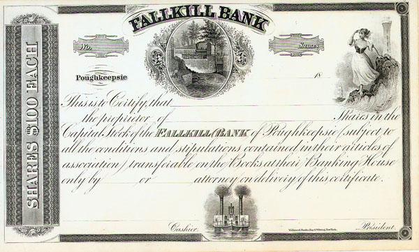 New York. Unissued stock certificate. Black. Multi-vignetted. Top center of trian crossing over dam. Top right of female standing at waters edge and bottom center of steamship. Extremely fine.