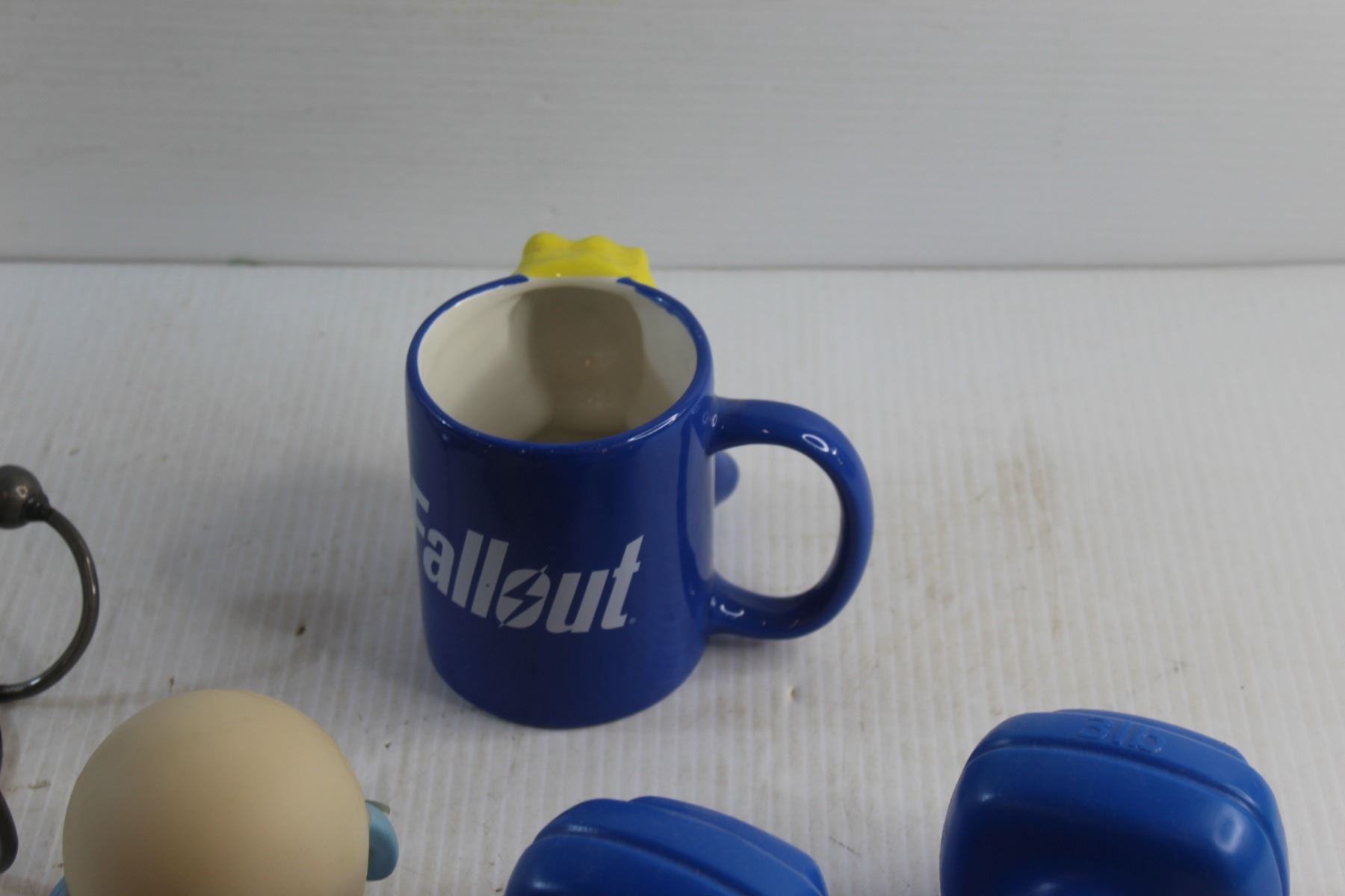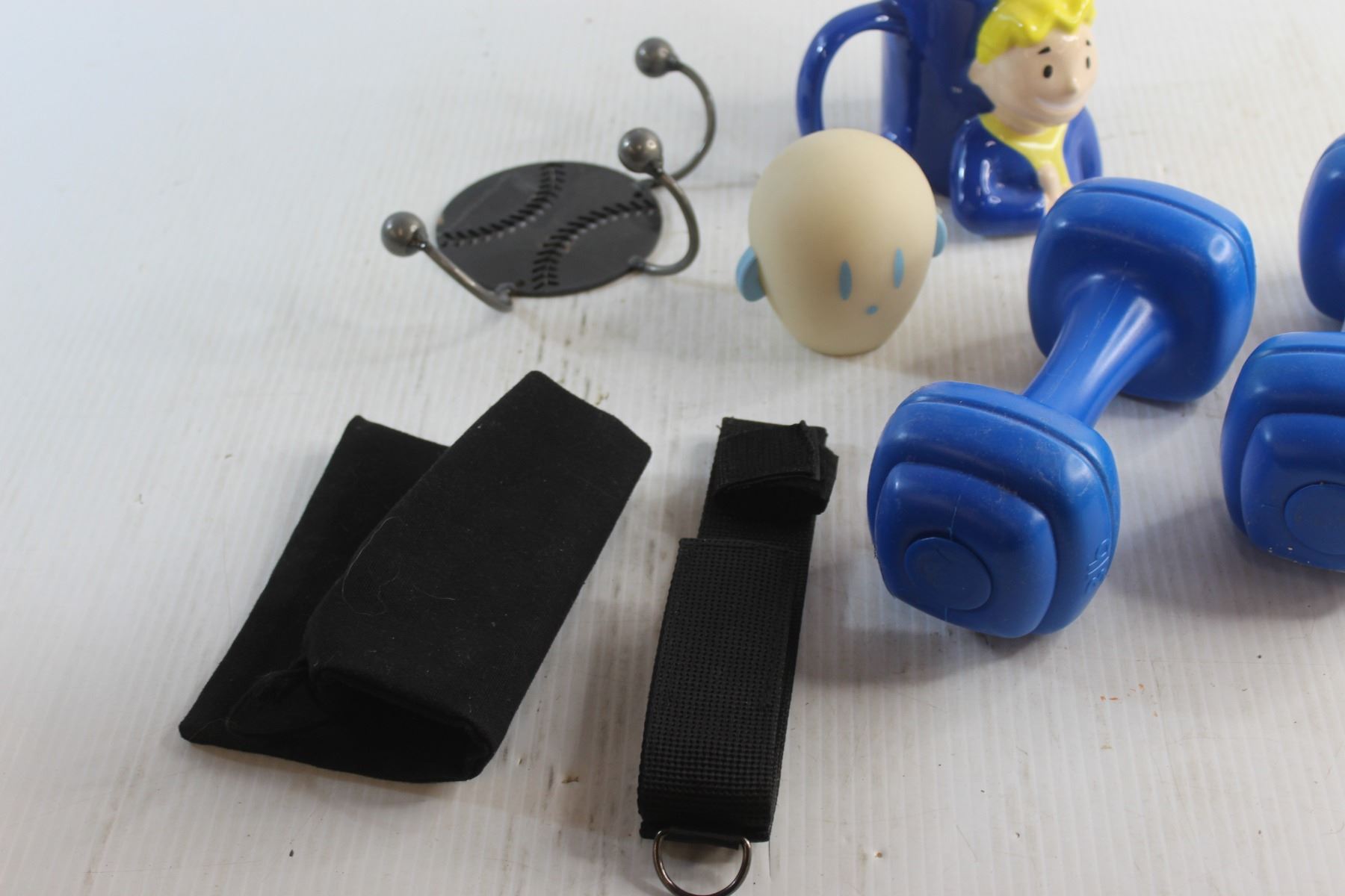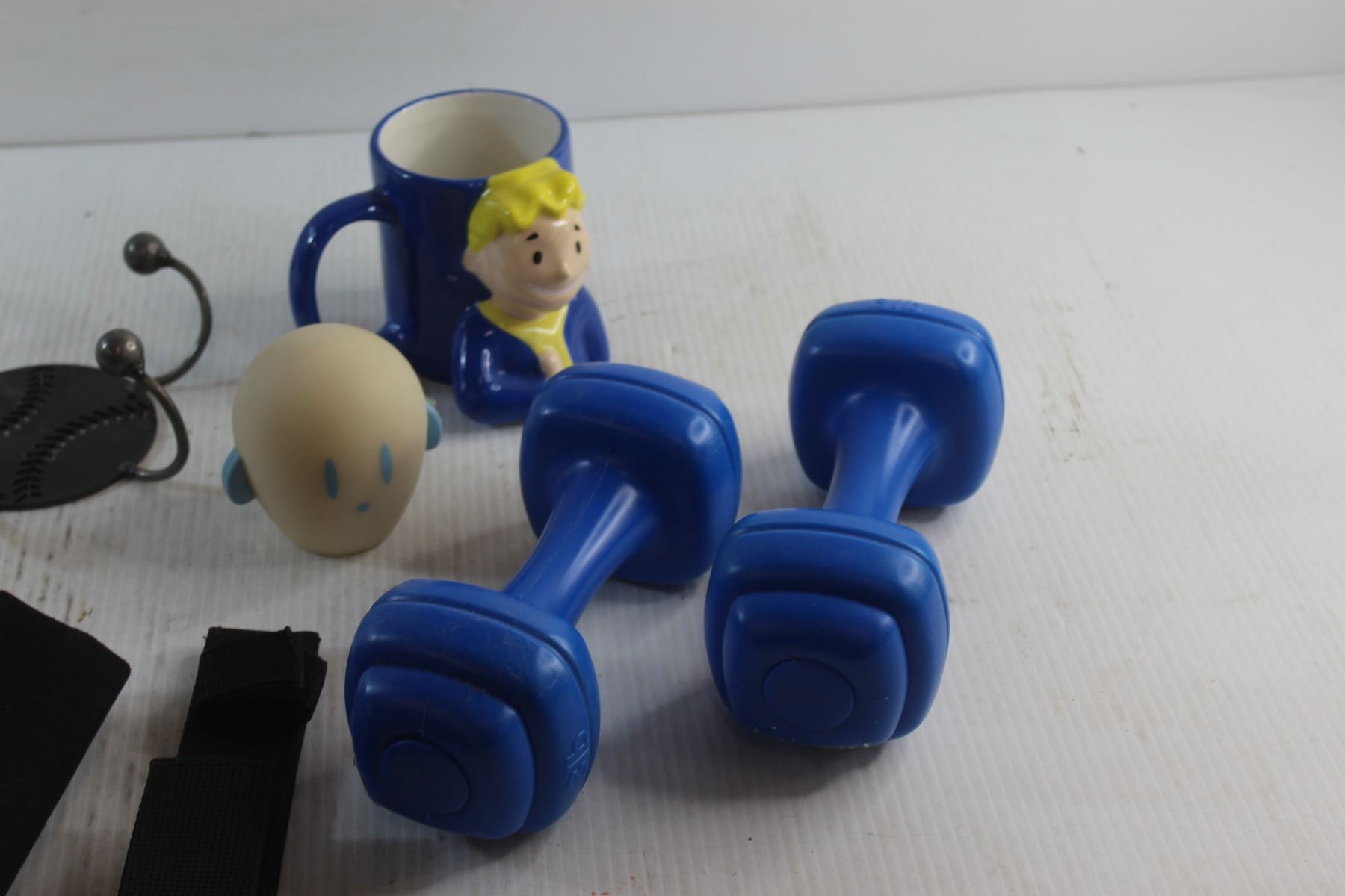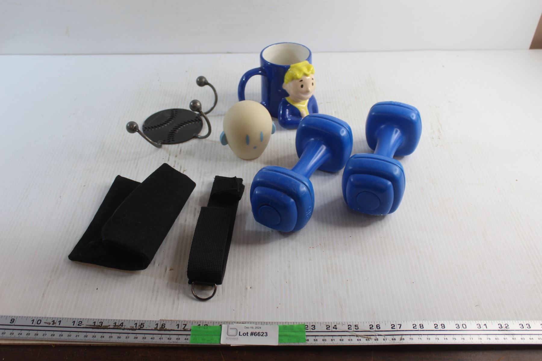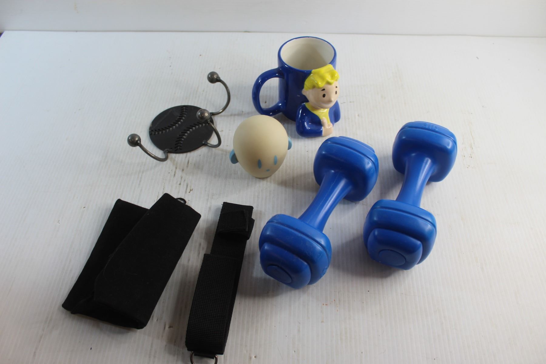 Fallout Mug, 3 lb Dumbbells, Coat Rack. Knife Sheath and Sack
