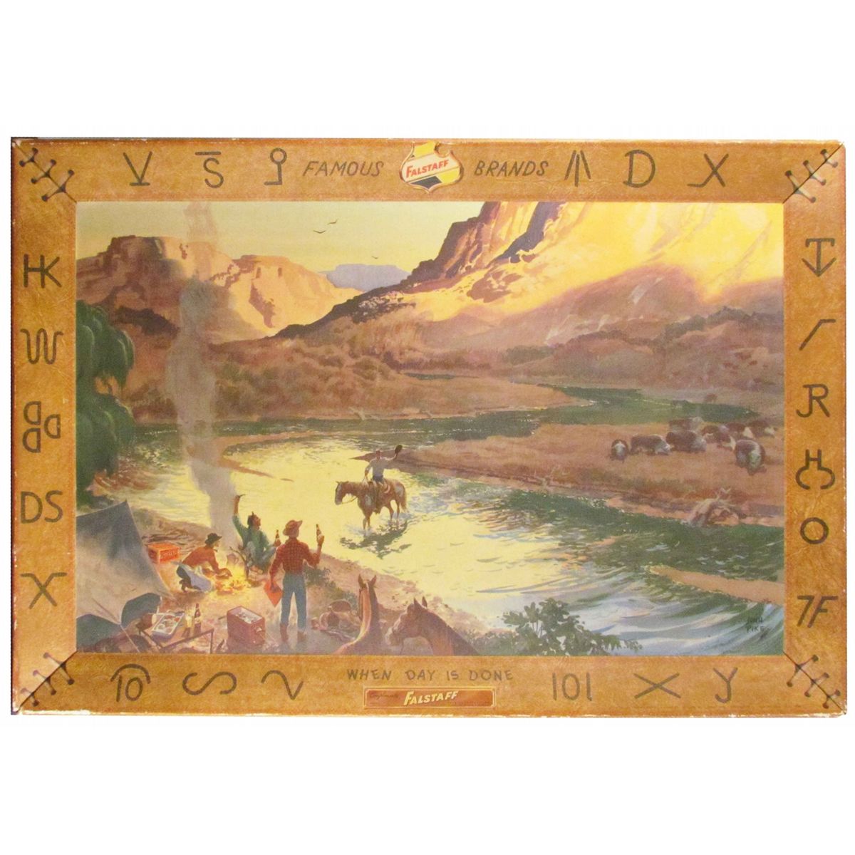 Falstaff Beer Self Framed Cardboard Sign. Entitled, "When Day is Done" by artist John Pike. Famous brands around perimeter with Story of Famous Brands on back. Excellent condition. 30 X 20 1/2 inches.