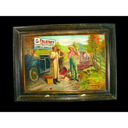 Falstaff Beer Self Framed Tin Sign, entitled The Peacemaker, Lemp Brewing Co., St. Louis, MO, some scratches and paint loss mostly on frame portion otherwise good condition, 31 x 23 inches.