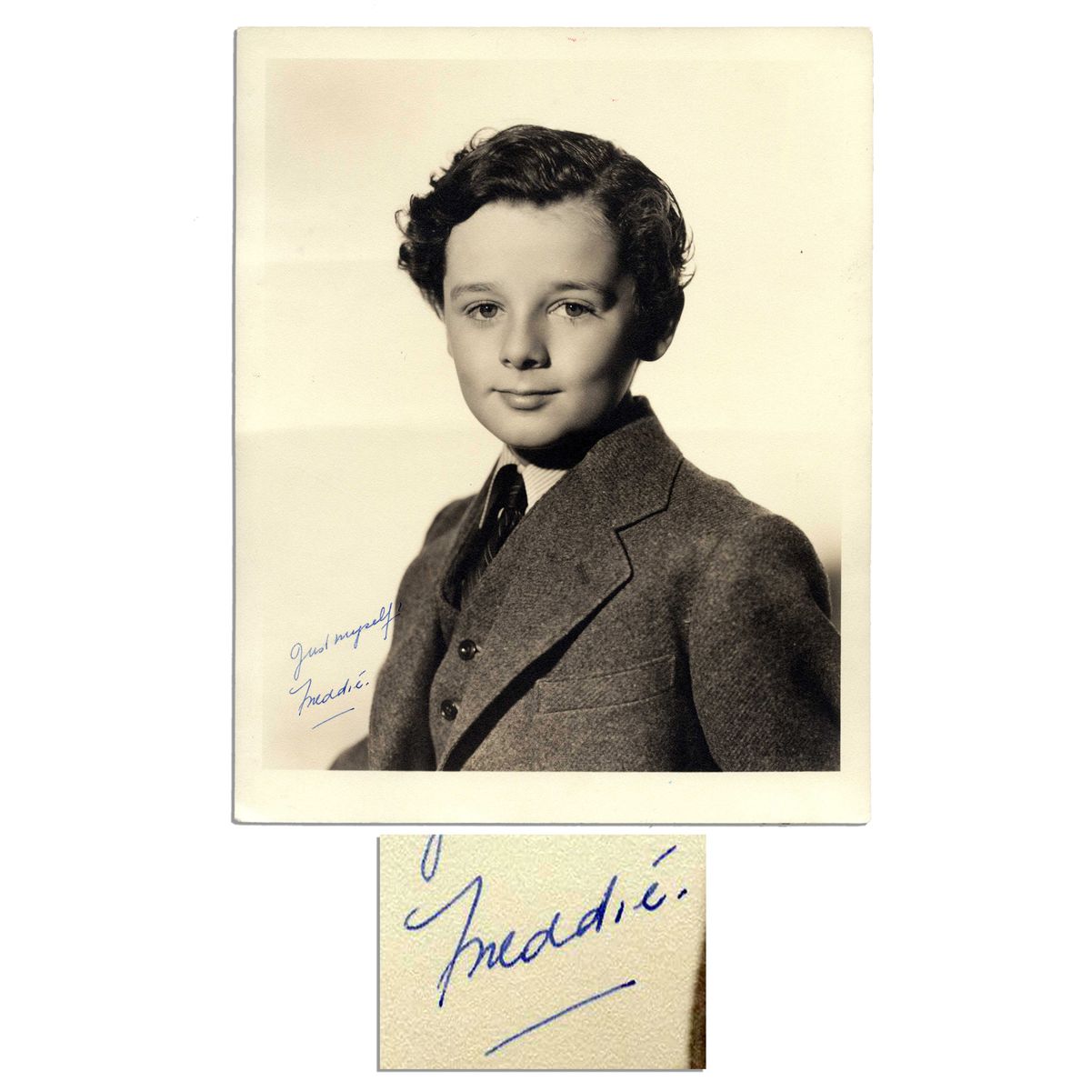 Golden Age of Hollywood child actor Freddie Bartholomew signed photo. ''Little Lord Fauntleroy'' signs, ''Just myself / Freddie'' in blue ink. Matte photo measures 8'' x 10'' and is in near fine condition.