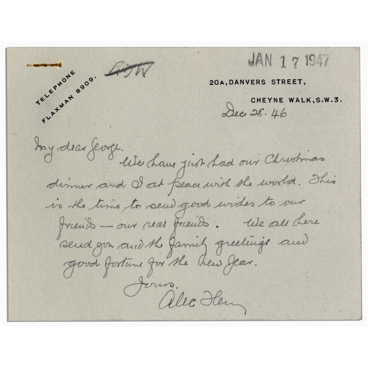 Alexander Fleming autograph letter signed, dated 25 December 1946 on his personal stationery. This Christmas letter reads in full: ''My dear George. We have just had our Christmas dinner and I am at peace with the world. This is the time to send good wishes to our friends -- our real friends. We all here send you and the family greetings and good fortune for the New Year. Yours. Alex Fleming''. Measures 4.5'' x 3.5''. Date stamp to top right, notation and staple mark to top left, else near fine condition.