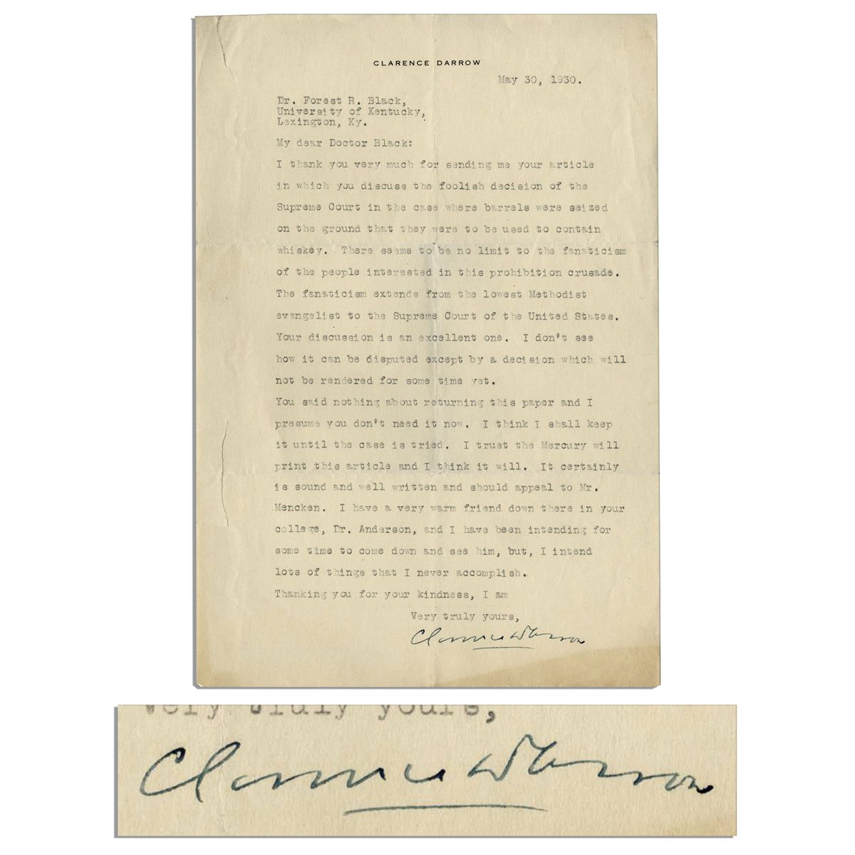 Clarence Darrow typed letter signed, dated 30 May 1930 on his personal stationery. Letter is addressed to Doctor Forest R. Black, a law professor at the University of Kentucky who wrote a book on prohibition, ''Ill Starred Prohibition Cases: A Study in Judicial Pathology''. Letter reads in full: ''I thank you very much for sending me your article in which you discuss the foolish decision of the Supreme Court in the case where barrels were seized on the ground that they were to be used to contain whiskey. There seems to be no limit to the fanaticism of the people interested in this prohibition crusade. The fanaticism extends from the lowest Methodist evangelist to the Supreme Court of the United States. Your discussion is an excellent one. I don't see how it can be disputed except by a decision which will not be rendered for some time yet. You said nothing about returning this paper and I presume you don't need it now. I think I shall keep it until the case is tried. I trust the Mercury will print this article and I think it will. It certainly is sound and well written and should appeal to Mr. Mencken. I have a very warm friend down there in your college, Dr. Anderson, and I have been intending for some time to come down and see him, but, I intend lots of things that I never accomplish. Thanking you for your kindness.'' Signed ''Clarence Darrow'' in blue ink. One page letter measures 7'' x 10.5'' with toning and light folds throughout. Else very good condition.