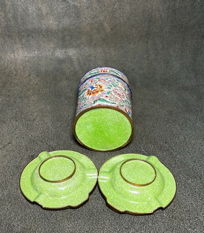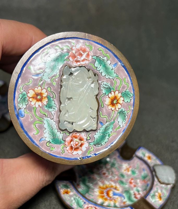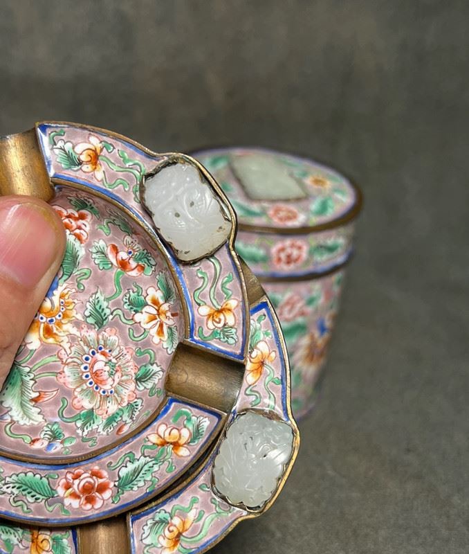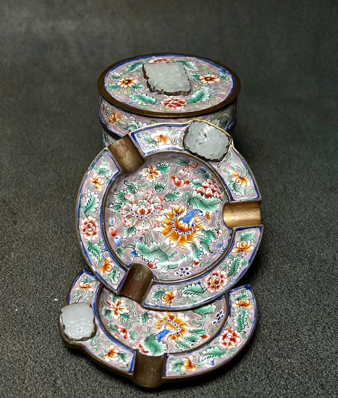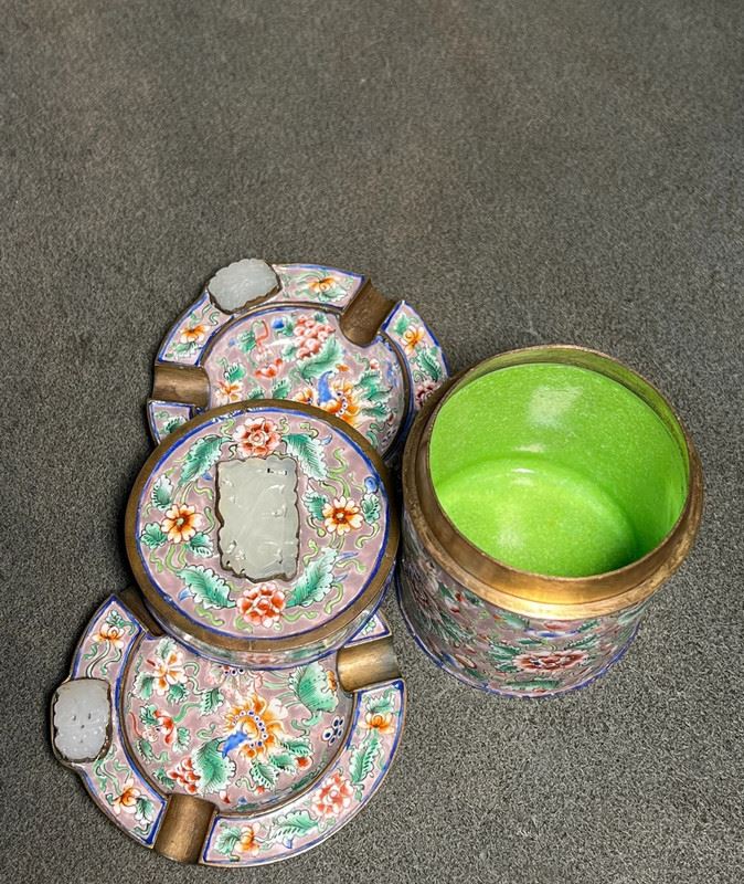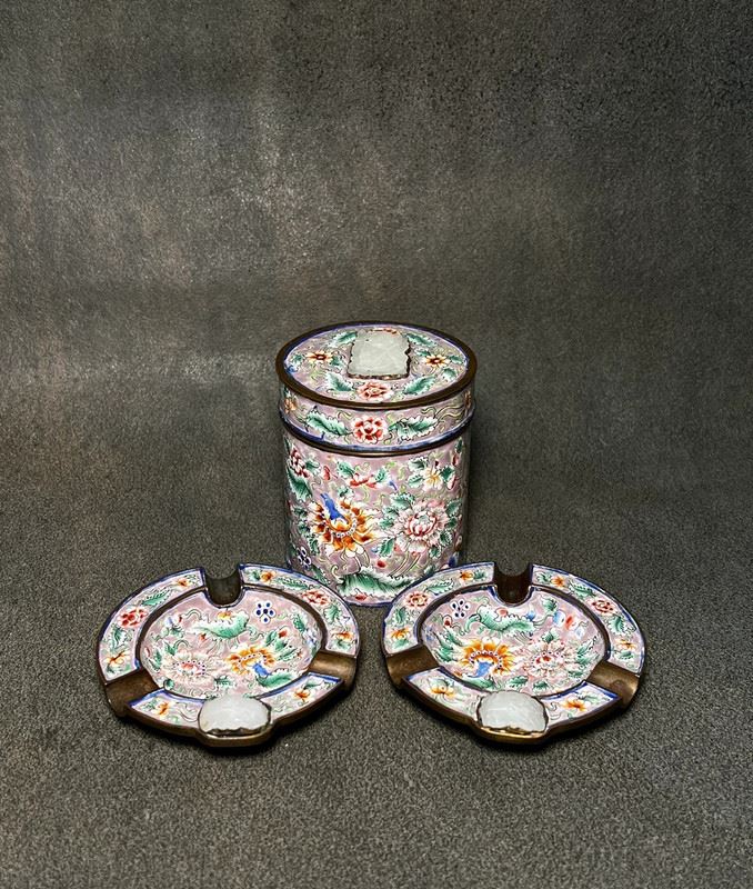 This set consists of a tea caddy and two ashtrays, finely decorated in famille rose enamels with gilt floral motifs. The surfaces are richly painted in vibrant colors, creating an ornate and elegant design. The lid of the tea caddy is adorned with a white jade plaque, adding refinement and charm. The interior of the tea caddy is covered with a vivid green glaze, providing a refreshing contrast to the ornate exterior. The matching ashtrays share the same floral decoration, combining utility with decorative appeal. A well-preserved ensemble that reflects exquisite craftsmanship and cultural sophistication, suitable for both collection and display.