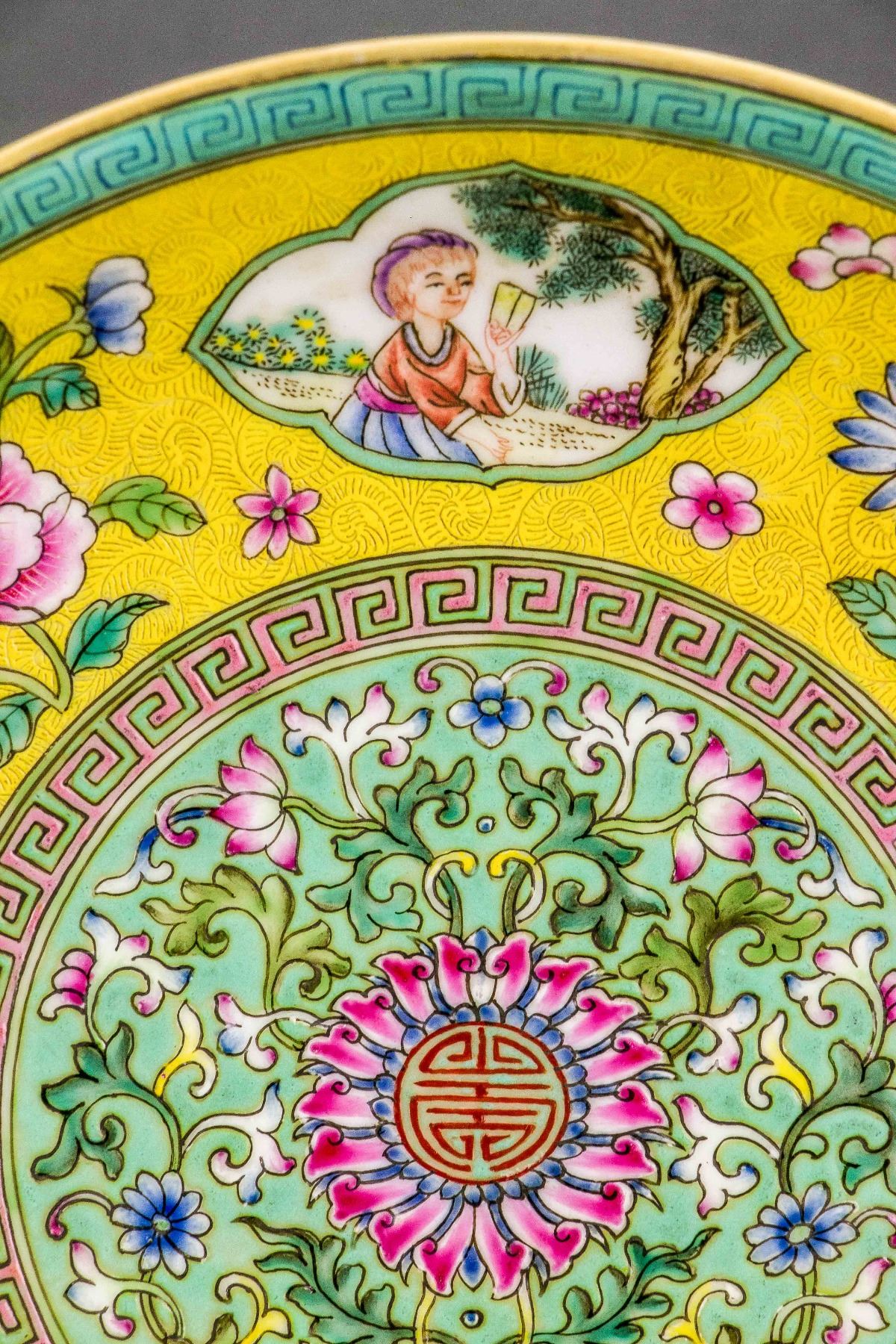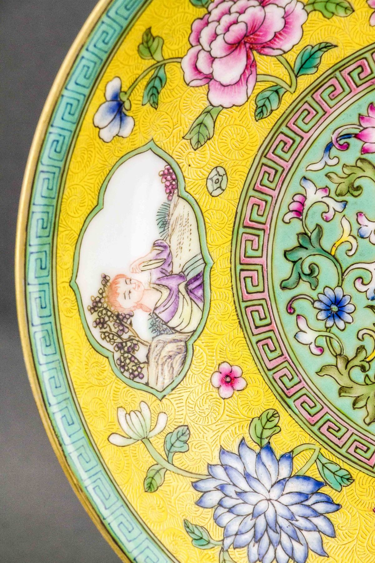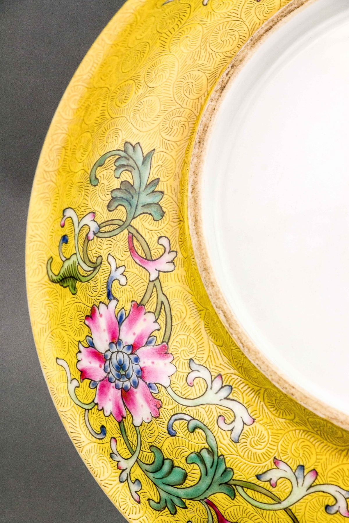 Chinese export Famille Rose and gilt porcelain saucer; of yellow colour; gilt on rim; with portrait of western figures, floral and leafy pattern on front; flower pattern on exterior body; six character Qianlong mark on base; H: 4 cm, D: 21 cm, 328 grams