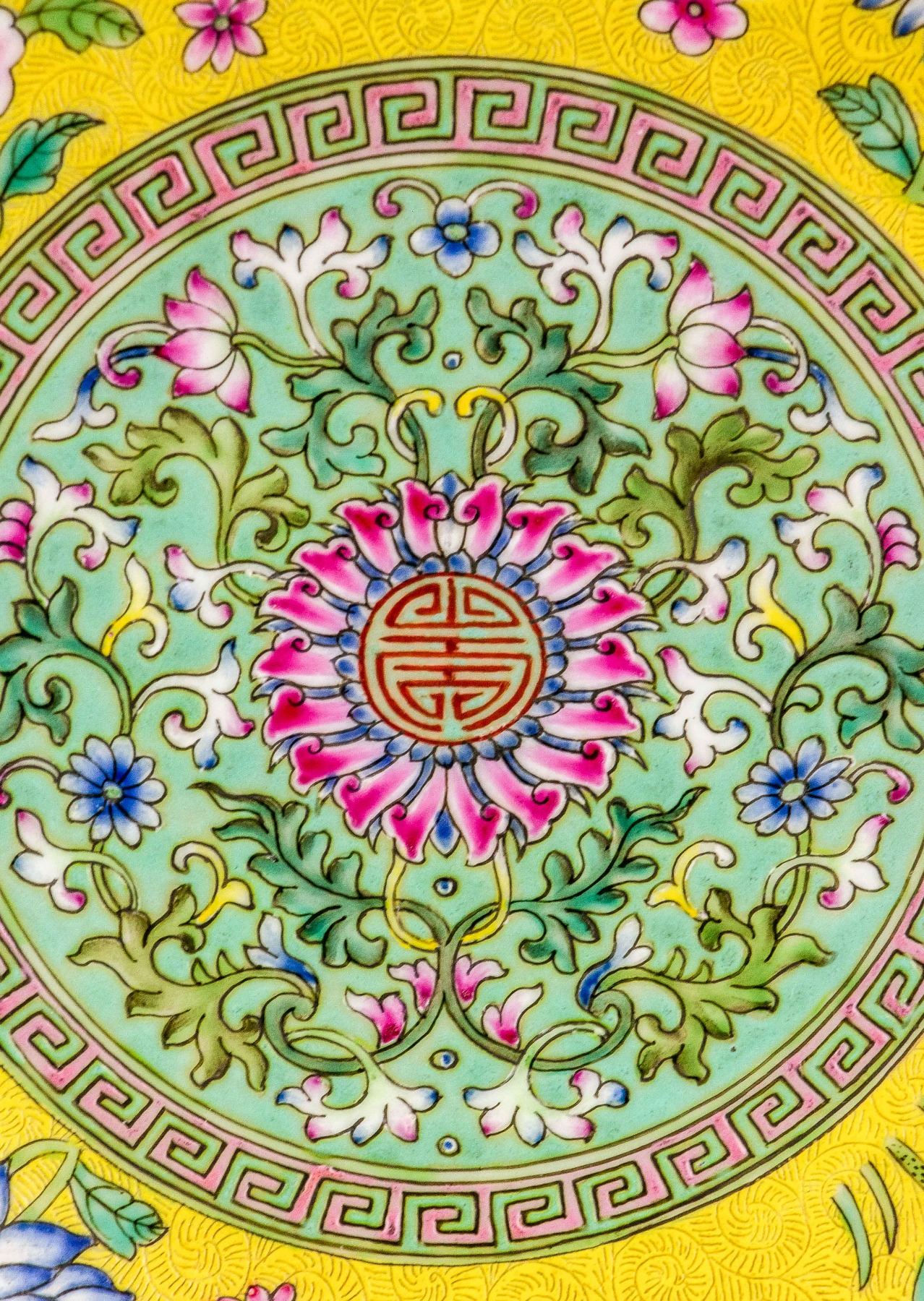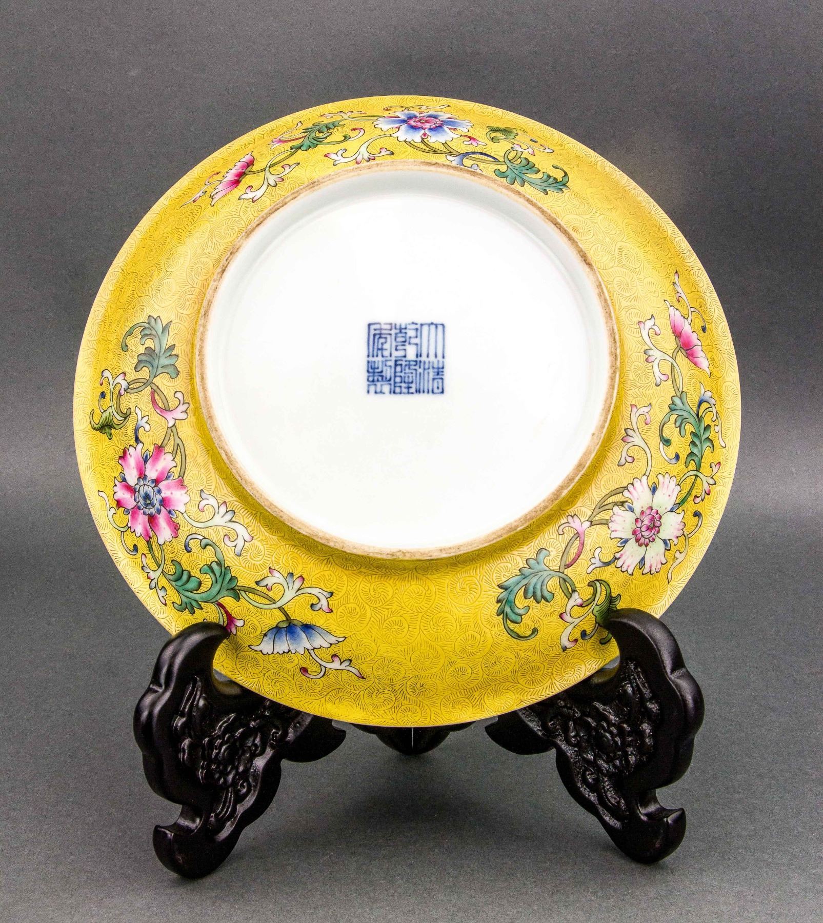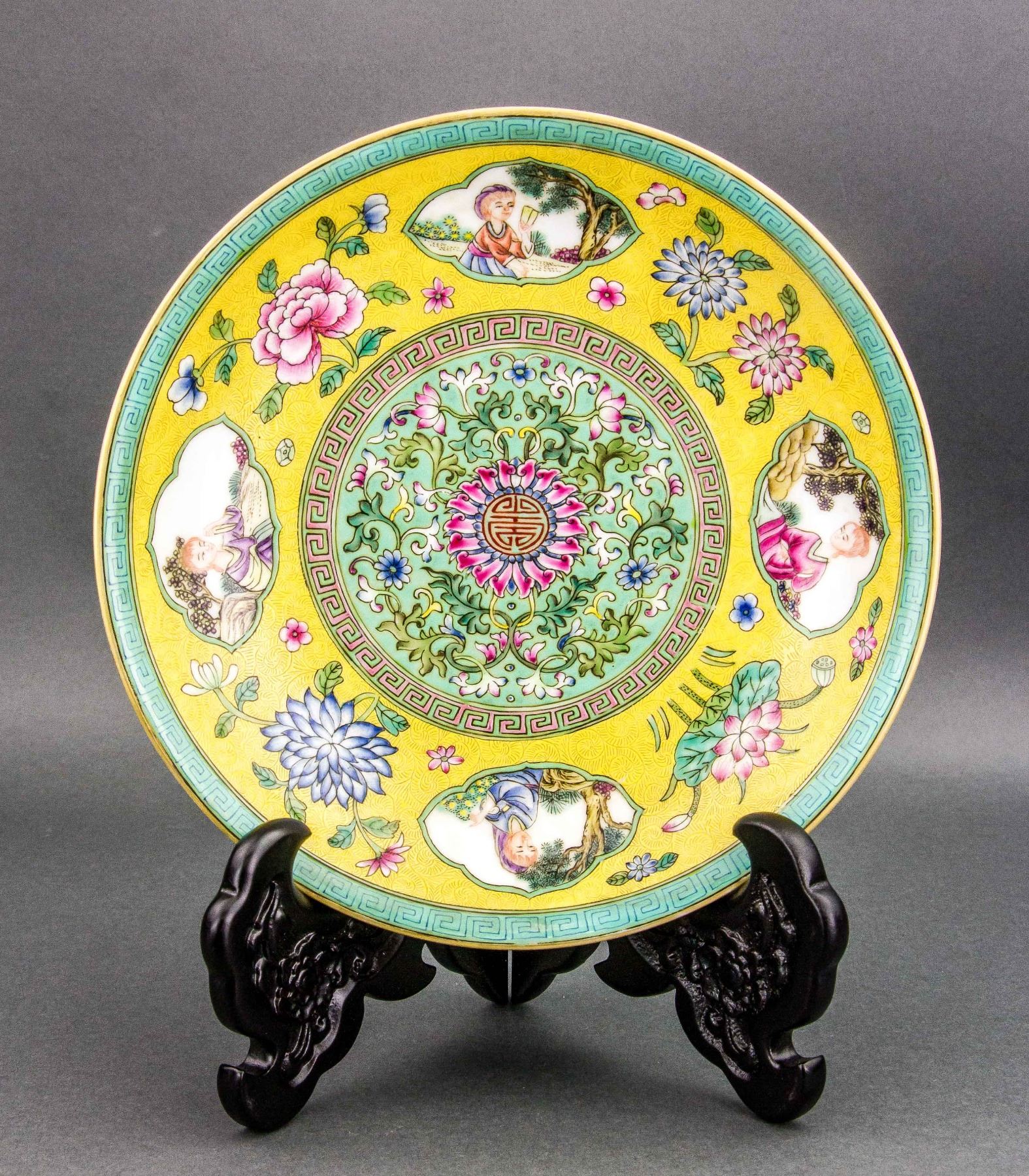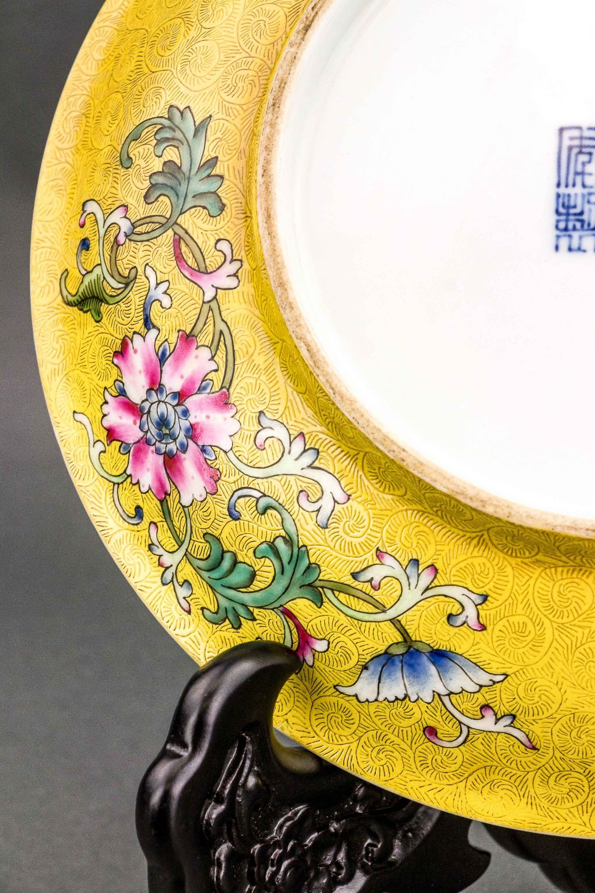 Chinese export Famille Rose and gilt porcelain saucer; of yellow colour; gilt on rim; with portrait of western figures, floral and leafy pattern on front; flower pattern on exterior body; six character Qianlong mark on base; H: 4 cm, D: 21 cm, 328 grams