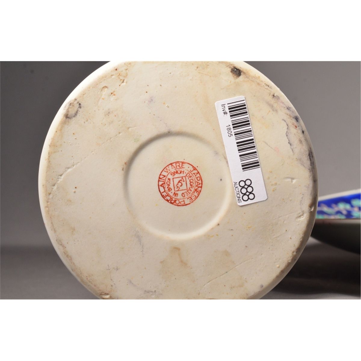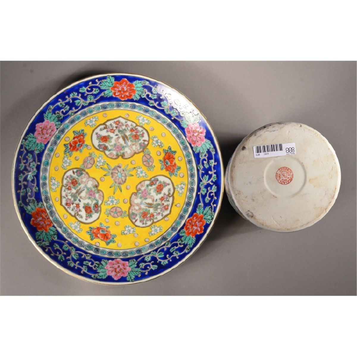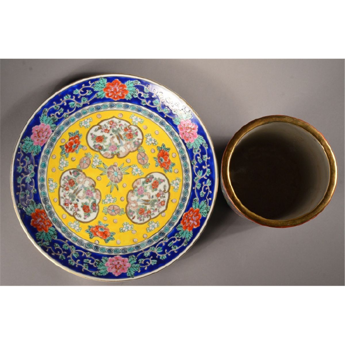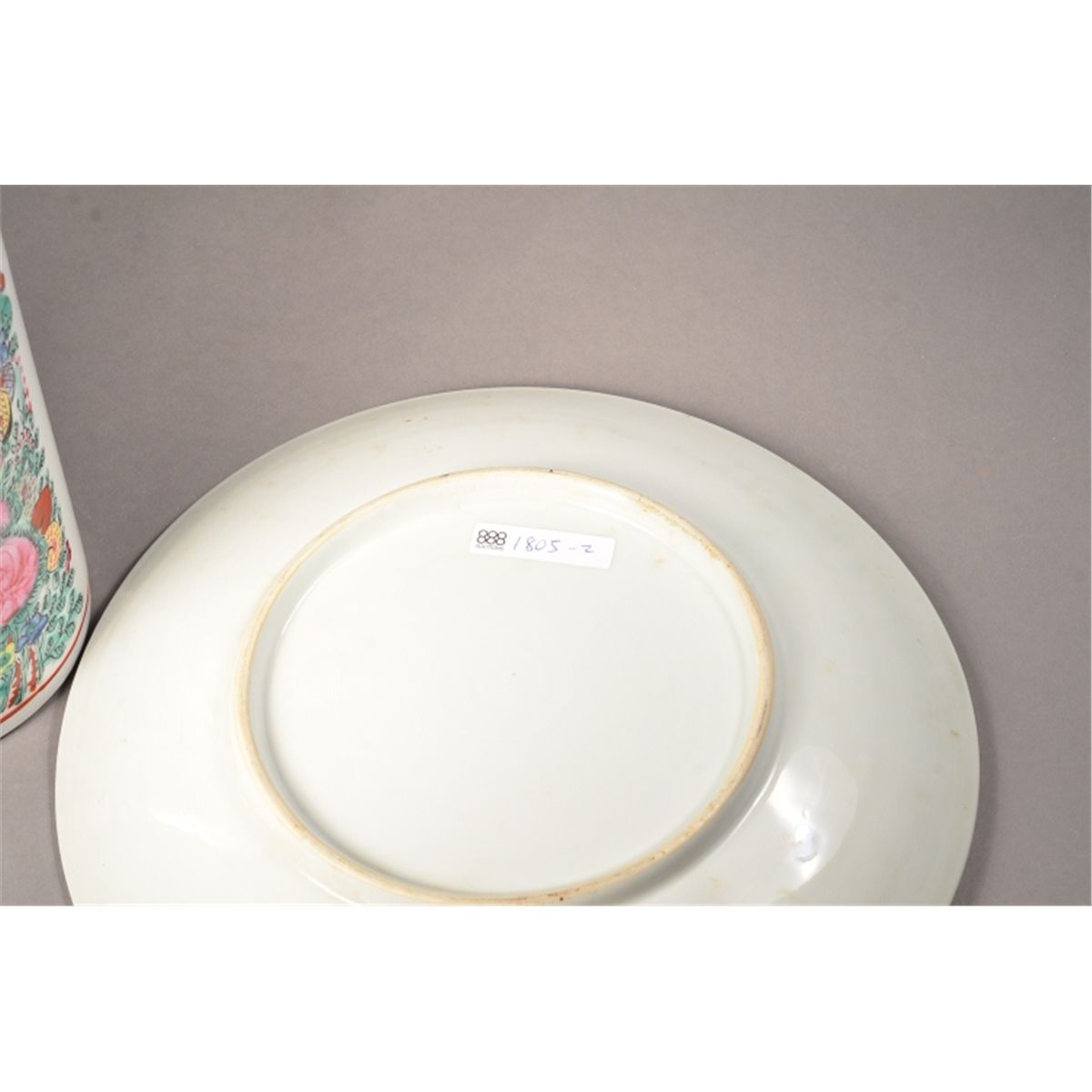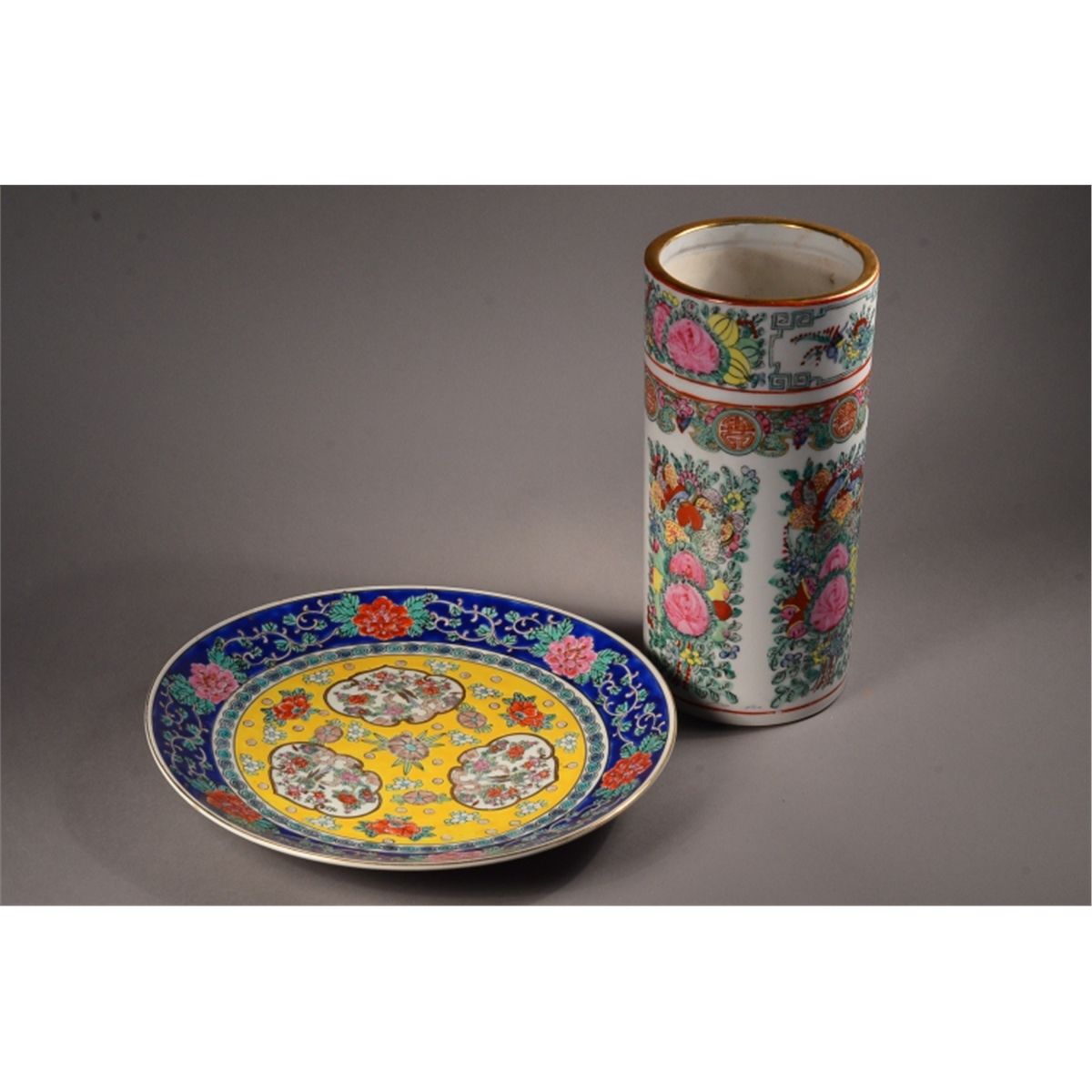 Set of two, Chinese Republic Period Famille Rose enameled porcelain plate and vase; plate with three medallion in centre featuring bird and floral design reserved on yellow ground; umbrella stand featuring butterfly and floral motif with Shou longevity design; marked 'PORCELAIN WARE JAPANESE', decorated in Hong Kong; 11 3/8" diameter (plate); 10 3/8" tall, 4 5/8" diameter