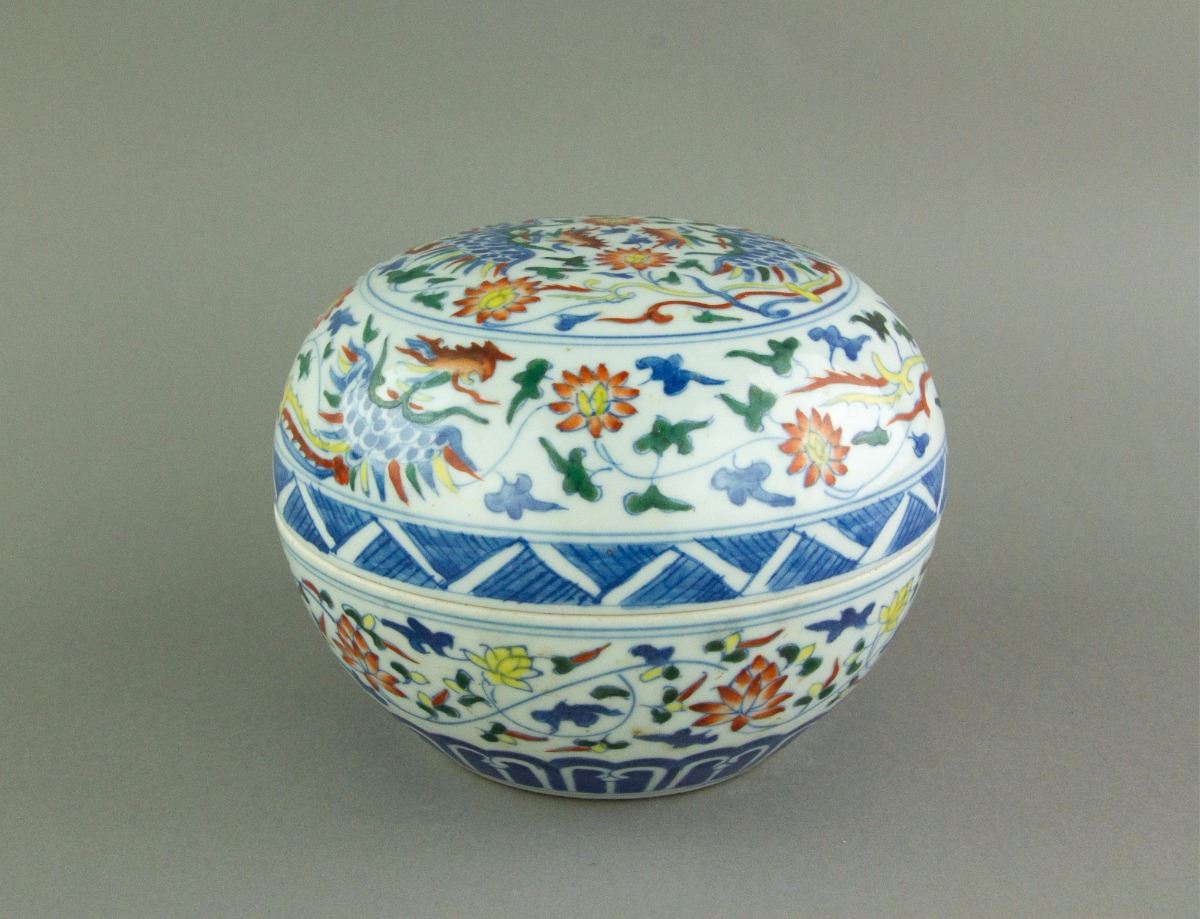Chinese Famille Rose porcelain box with cover; of compressed globular form; painted with pheonix amongst lotus scrolls; six-character Ming Chenghua mark on base; H: 11 cm, D :16.5 cm, 868 grams