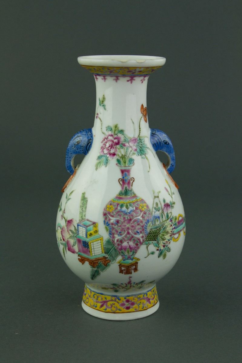 Chinese Famille Rose porcelain vase; of pear-shaped body with galleried mouth rim and splayed foot rim; flanked by double elephant handles; painted with Bogu auspicious emblems, scholarly items, and flowering precious vessels; the mouth rim is chipped and repaired; H: 20 cm, D: 12 cm, 453 grams