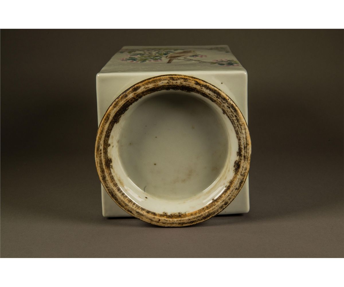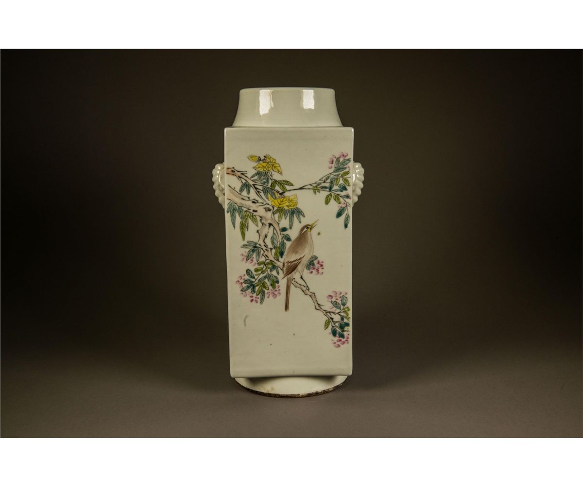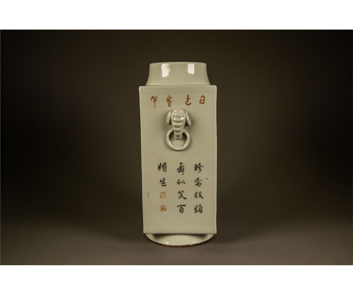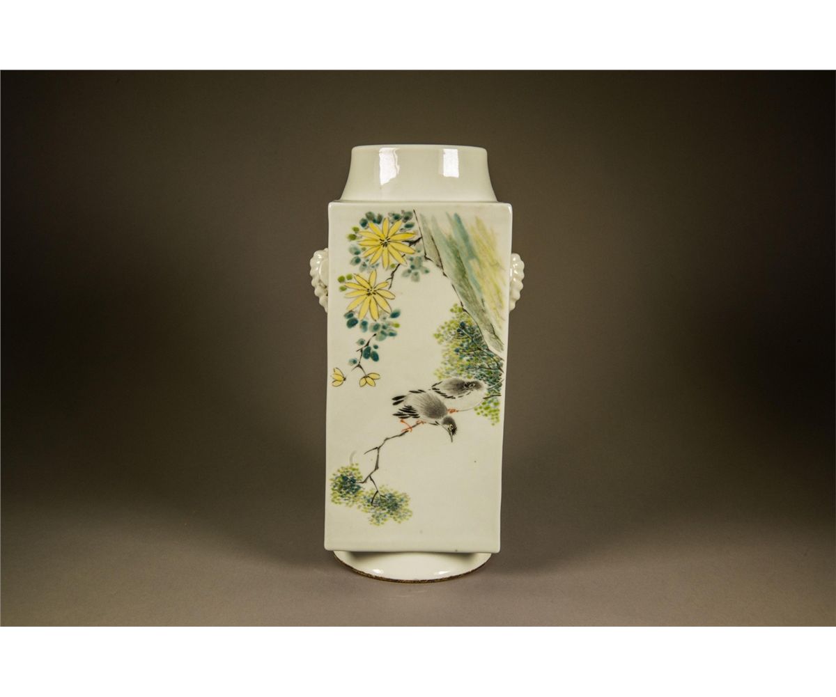 Chinese Famille Rose porcelain vase; of Cong form; with two elephant handles on side; featuring flowers and birds; signed by Ren Huanzhang from Zhushan Bayou; H: 34 cm, W: 16 cm, 3523 grams