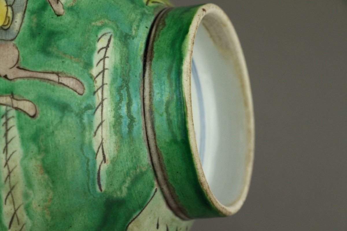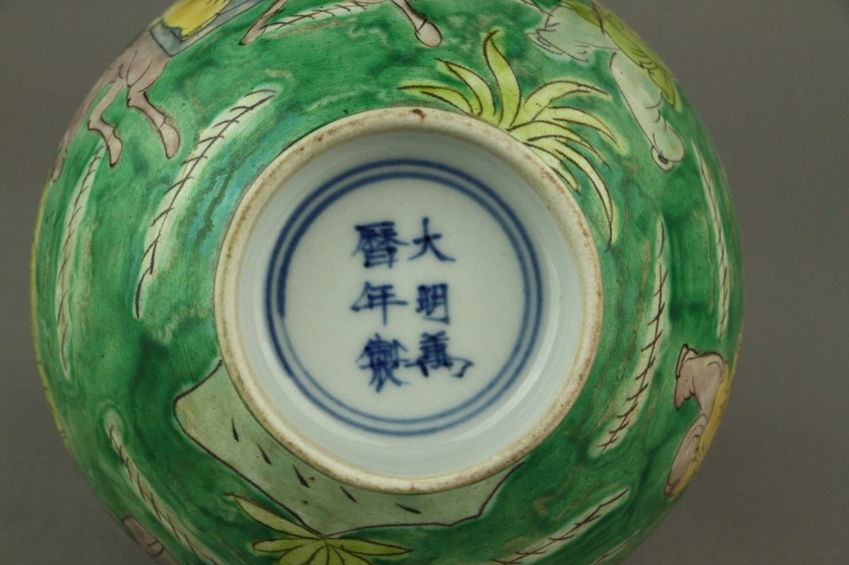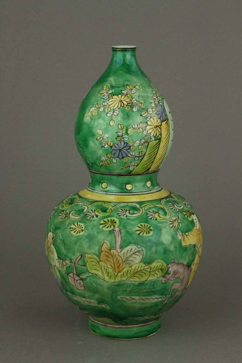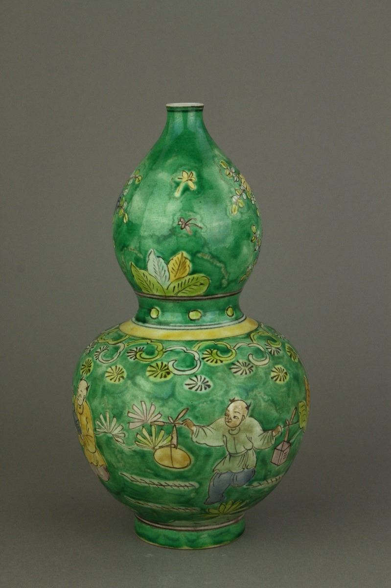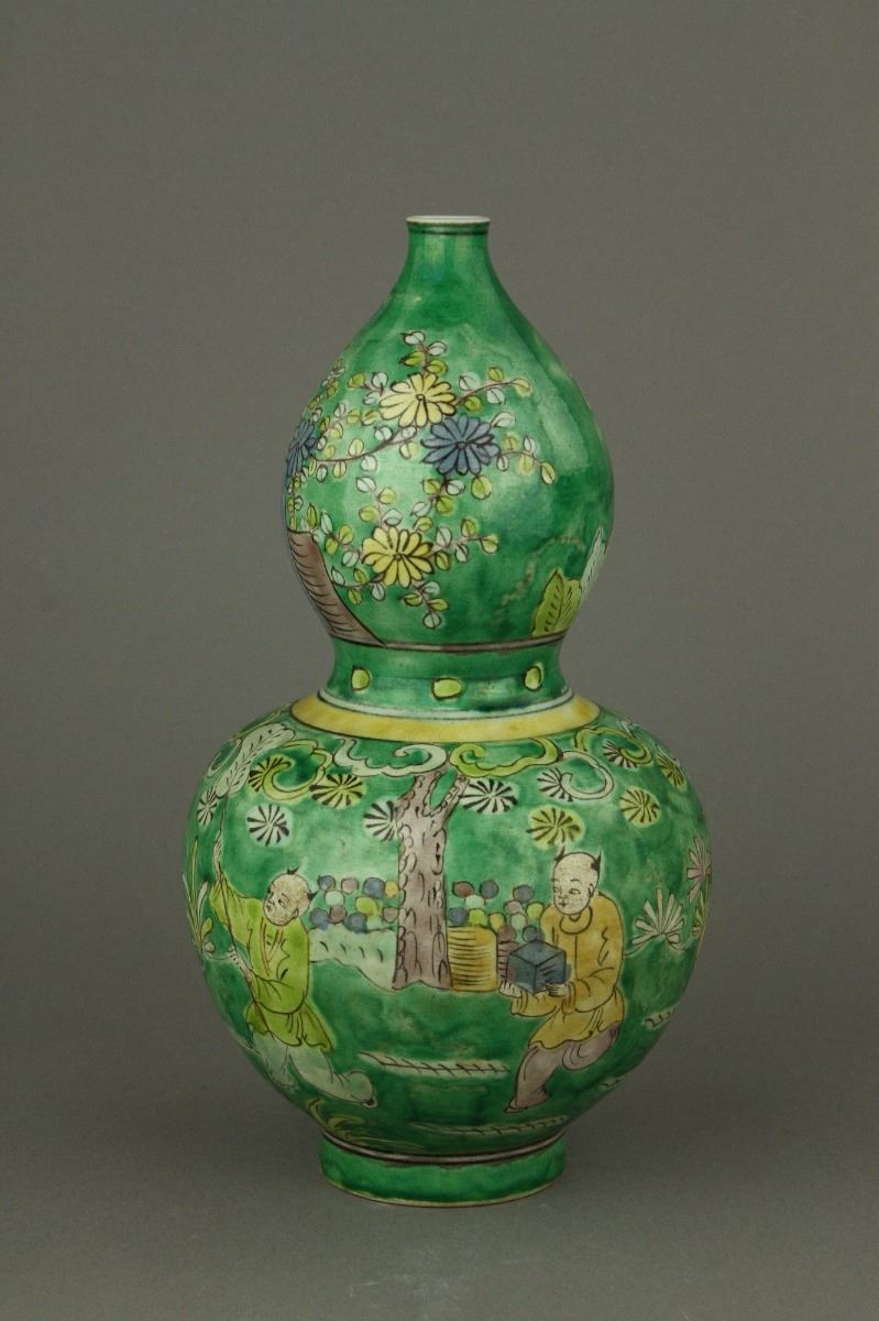 Chinese green ground Famille Verte porcelain vase; of double gourd form; painted with cluster of chrysanthemum on the upper bulb and children at leisure time on the lower bulb; six-character Wanli mark on base; H: 23 cm, D: 13 cm, 539 grams