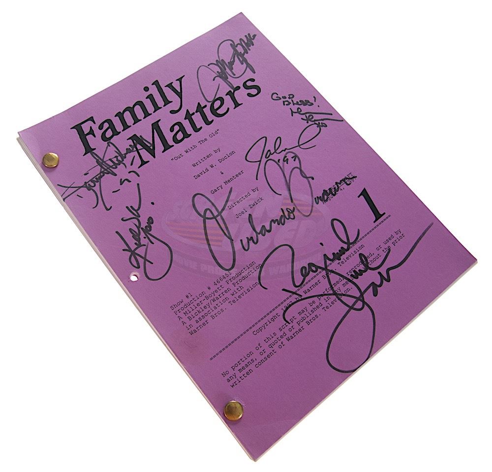 (ABC, 1989-1998) This 39 page script features all white pages and is titled "Out with the Old". The cover of the script has been autographed by following cast members:
