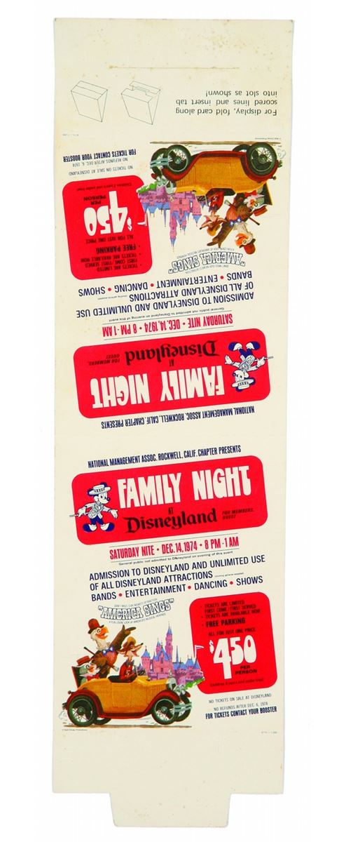 (Disneyland, 1974) Unused folding table card promoting a family night at Disneyland for members
