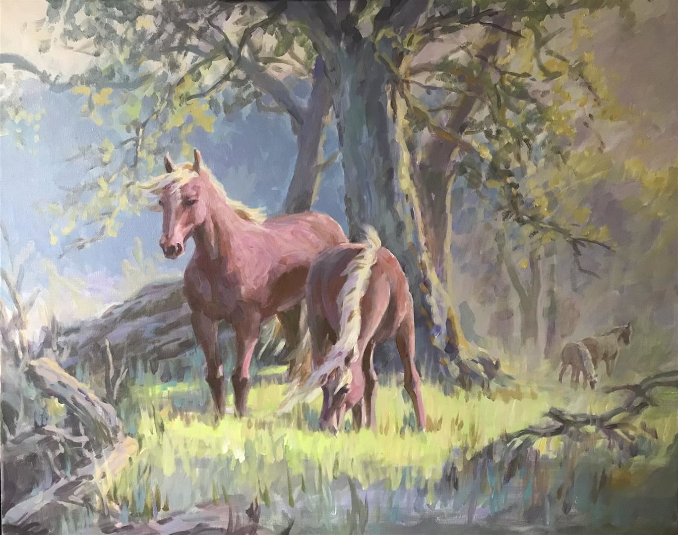 A 24x30" original acrylic on canvas by Richard Ho captures this charming equine family grazing together in Springtime.