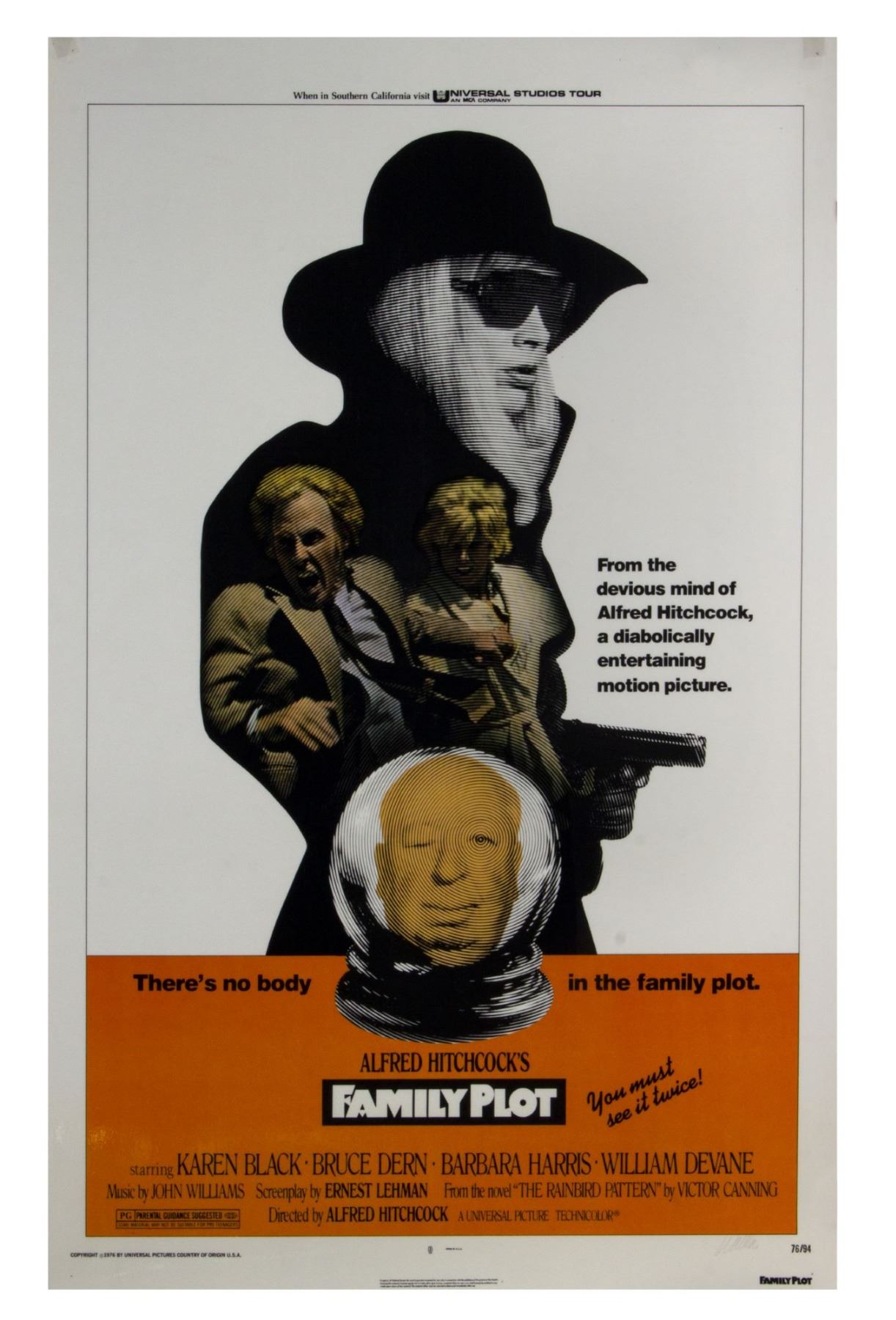 (Universal, 1976) An original one sheet poster for the Alfred Hitchcock film "Family Plot". This poster comes from the collection of Bill Wallen, and features Wallen's signature along the bottom margin. The poster was laminated by Wallen for use as his reference, and measures 41.25"x27.25". The condition is very good with some tape residue in the top corners of the poster.