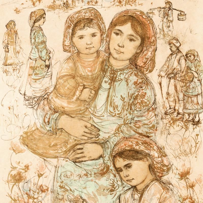 "Family in the Field" is a limited edition lithograph on rice paper, numbered and hand signed by Edna Hibel (1917-2014). Includes Certificate of Authenticity! Measures approx. 25" x 36" (with border), 22.5" x 32" (image).