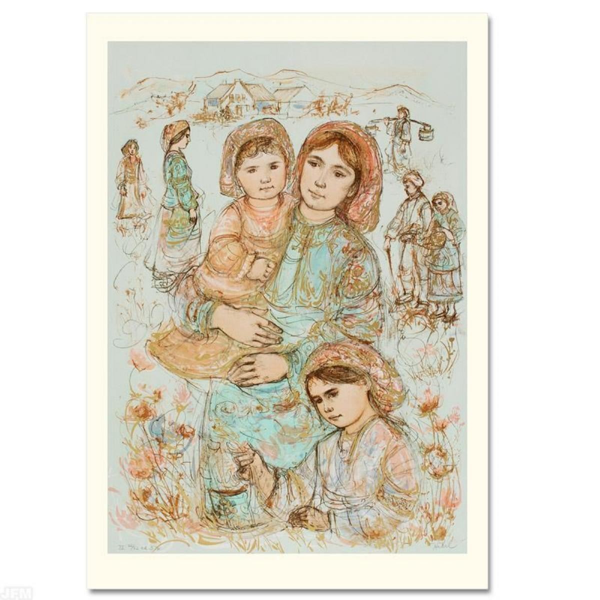 "Family in the Field" is a limited edition lithograph on paper, numbered and hand signed by Edna Hibel (1917-2014). Includes Certificate of Authenticity! Measures approx. 25" x 36" (with border), 22.5" x 32" (image).