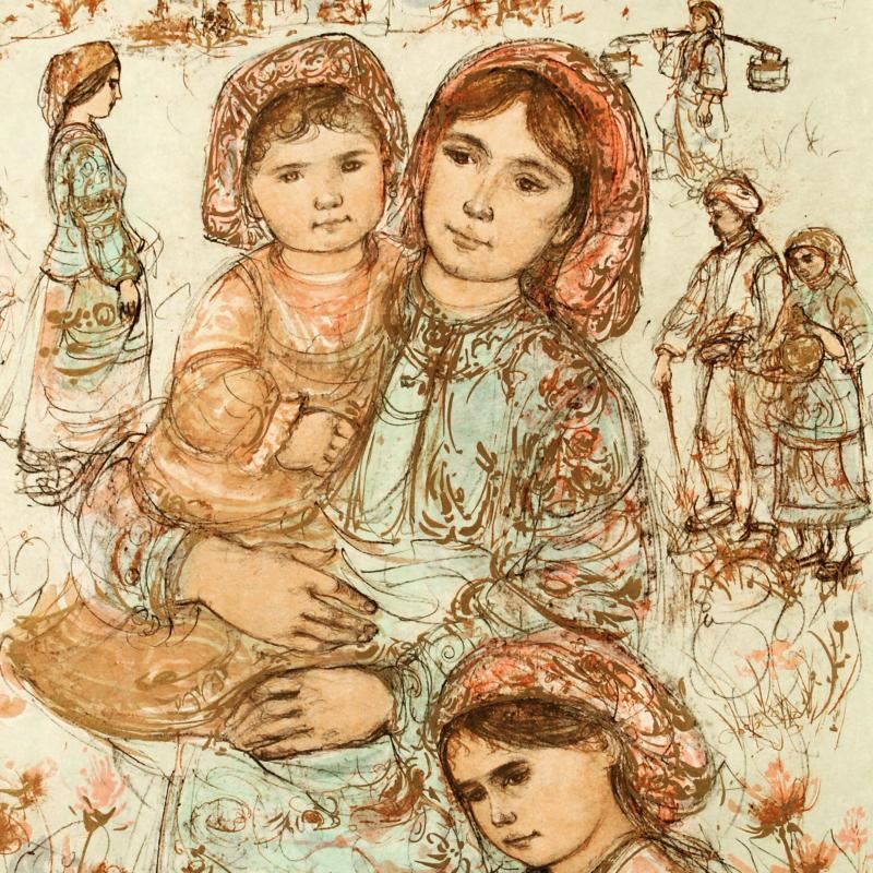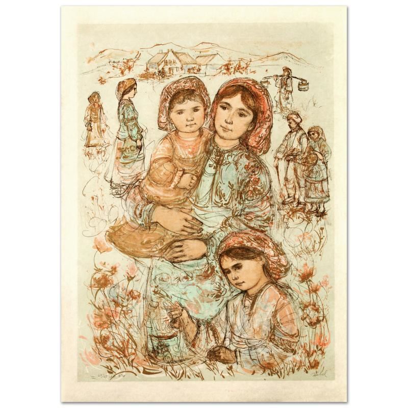 "Family in the Field" is a limited edition lithograph on rice paper, numbered and hand signed by Edna Hibel (1917-2014). Includes Certificate of Authenticity! Measures approx. 25" x 36" (with border), 22.5" x 32" (image).