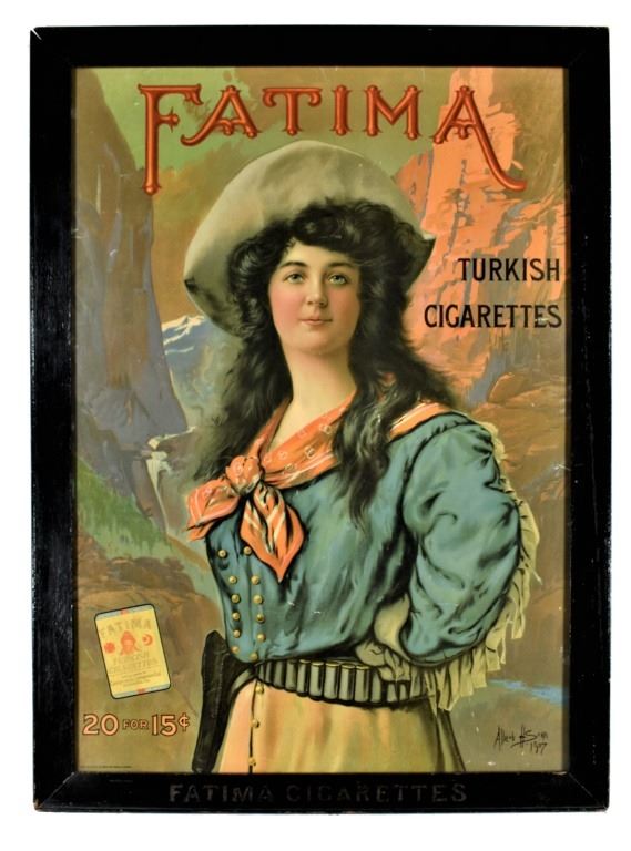 Famous Fatima Turkish Cigarettes Cowgirl Cardboard Sign in original frame. Copyright 1907 by the American Tobacco Co. Beautiful cowgirl captured by artist Albert H. Sonn (1867-1936). Some rubs and scratches otherwise very good overall condition. 20 1/2 X 28 inches.