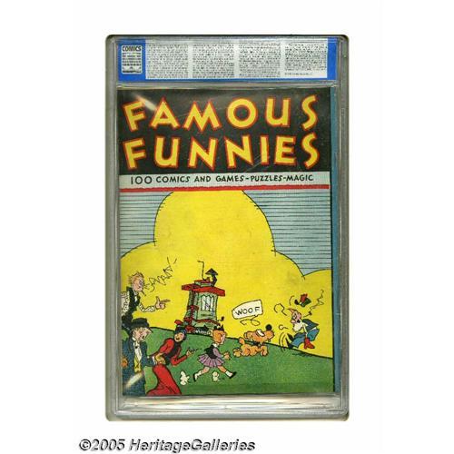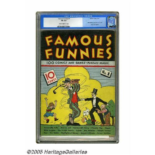 <B>Famous Funnies #1 (Eastern Color, 1934) CGC FN 6.0 Cream to light tan pages.</B></I> This was the first comic book sold to the general public through newsstand distribution! You can't get much more historically significant than that. Just to run down the history for you: this comic's predecessors " "<B>Funnies On Parade</B></I>, " "<B>Famous Funnies: A Carnival Of Comics</B></I>, and a couple of other one-shots were giveaway premiums, the success of which indicated that there might be reader demand for the format. Then came " "<B>Famous Funnies, Series 1</B></I>, which was sold to the general public through chain stores. The new format having passed those tests, Eastern Color brought out this first issue of a monthly newsstand series. It would run for over twenty years. Like all early comic books, this contained comic strip reprints -- the featured characters included Mutt and Jeff, Tailspin Tommy, and Joe Palooka (at the time, some naysayers wondered why anyone would pay 10 cents for the same strips they had already read for free in the newspapers). This comic is currently ranked #58 on Overstreet's list of the most valuable Golden Age comics -- the only reason it's not much higher is that while most comics have NM- prices listed in the Guide, no NM- copy of this is known to exist. In fact, only two copies have received higher grades than our offering to date. And we shouldn't forget to mention that the issue is a Gerber ""9"" or ""Very Rare,"" so forget about waiting for another one to come along! Overstreet 2005 FN 6.0 value = $9,129. CGC census 9/05: 1 in 6.0, 2 higher. <BR><BR><B>Important notice:</B> Heritage usually auctions material at the rate of 200-250 lots per hour. On some occasions eBay Live bid software or the Internet may not be able to keep up with the pace of the auction. We recommend placing a realistic absentee bid now as insurance to avoid disappointment. Occasionally the auctioneer may eliminate or reject an eBay Live bid, and the auctionee