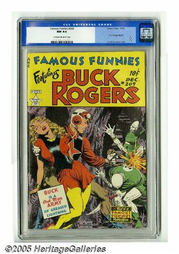 <B>Famous Funnies #209 (Eastern Color, 1953) CGC NM 9.4 Cream to off-white pages.</B></I> This landmark title, launched way back in 1934, was nearing the end of its run when this issue came out in 1953. The Buck Rogers feature began with this issue, accompanied by some of the most dynamic covers in comic book history by the incomparable Frank Frazetta. For eight glorious issues, <B>Famous Funnies</B></I> was on top of the comics world. This wonderful copy shows clearly why Frazetta is so revered. Overstreet 2005 NM- 9.2 value = $1,600. CGC census 6/05: 2 in 9.4, 2 higher.