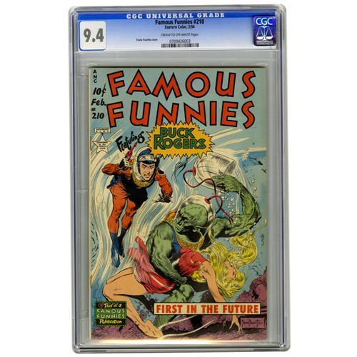 <B>Famous Funnies #210 (Eastern Color, 1954) CGC NM 9.4 Cream to off-white pages.</B></I> Frank Frazetta's cover for this issue is deserving of many superlatives, but we'll let you gaze upon the image and you'll have no trouble coming up with your own! The same's true for this copy, which is near the top of CGC's census report. Overstreet 2006 NM- 9.2 value = $1,625. CGC census 4/06: 7 in 9.4, 2 higher.