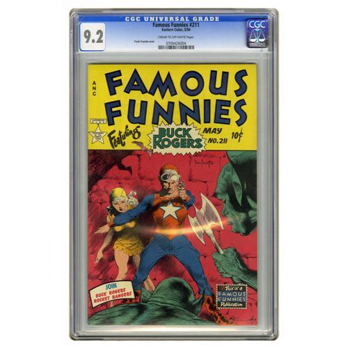 <B>Famous Funnies #211 (Eastern Color, 1954) CGC NM- 9.2 Cream to off-white pages.</B></I> No portrayal of Buck Rogers could ever top the great run of Frank Frazetta covers on <B>Famous Funnies</B></I> #209-216! Our offering is among the highest-graded copies of this issue. Overstreet 2006 NM- 9.2 value = $1,625. CGC census 4/06: 6 in 9.2, 2 higher.