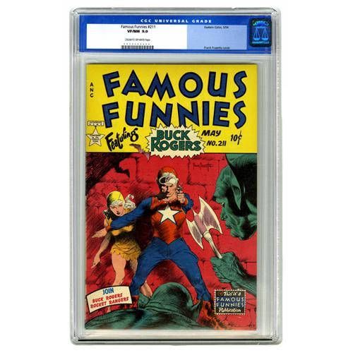 <B>Famous Funnies #211 (Eastern Color, 1954) CGC VF/NM 9.0 Cream to off-white pages.</B></I> Buck Rogers and Wilma Deering never looked better than on a <B>Famous Funnies</B></I> cover drawn by Frank Frazetta -- here's one of Frazetta's best! This copy is flat, tight, and well cut, with only a hint of sun fading along the extreme edge of the spine. Overstreet 2006 VF/NM 9.0 value = $1,188; NM- 9.2 value = $1,625. CGC census 4/06: 6 in 9.0, 8 higher.