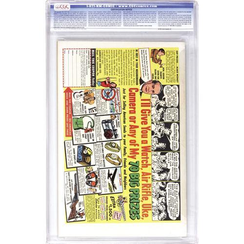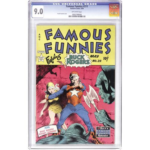 <B>Famous Funnies #211 (Eastern Color, 1954) CGC VF/NM 9.0 Off-white pages.</B></I> Frank Frazetta, Frank Frazetta, and furthermore, Frank Frazetta. Sometimes these descriptions write themselves! Seriously, most high-grade copies of this highly collectible issue seem to have the less desirable "cream to off-white" page quality, setting this "off-white" specimen apart from the crowd. Overstreet 2006 VF/NM 9.0 value = $1,188; NM- 9.2 value = $1,625. CGC census 6/06: 6 in 9.0, 8 higher. <BR><BR><B>Important notice:</B> Heritage usually auctions material at the rate of 200-250 lots per hour. On some occasions eBay Live bid software or the Internet may not be able to keep up with the pace of the auction. We recommend placing a realistic absentee bid now as insurance to avoid disappointment. Occasionally the auctioneer may eliminate or reject an eBay Live bid, and the auctioneer may also reopen a lot after the close of the eBay live bidding (usually because we missed an audience bid), and may reject your bid even if it shows you as the winning bidder. By bidding via eBay Live, you agree that Heritage may award the lot to another bidder at its sole discretion under the circumstances described above or any other reasonable circumstances. Since eBay bids are not shown to us until we open the lot on the floor, we treat those bids just like floor bids. In most cases the floor responds before the eBay bid is presented to us, due to Internet lag time, so for consistency we have made it a policy that floor bids are always considered first over tie eBay live bids. Also please note that all Heritage lots purchased through eBay Live carry a 22.5% Buyer's Premium. Please make sure you read the Terms and Conditions before you bid. This lot is being auctioned in conjunction with a live floor auction by Heritage Auction Galleries. All final auction and invoice information will be supplied by Heritage Auction Galleries, and all other information should be considered preliminary. Lot:41001 <BR><BR><B>Winning Notification and Billing:</B> After the FINAL session in this auction is complete, Heritage will send e-mail and snail mail invoices. This process normally takes several days. All final auction and invoice information will be supplied by Heritage Auction Galleries, and all other information should be considered preliminary. <BR><BR>This auction will be conducted on a live auction floor and over the Internet through eBay Live. If you choose to place an absentee bid, please take a moment to <font color='#0000ff'><u><a href='http://pages.ebay.com/liveauctions/help/before/laabsentee.html'>learn how eBay Live absentee bidding works</a></u></font><font color='#000000'>